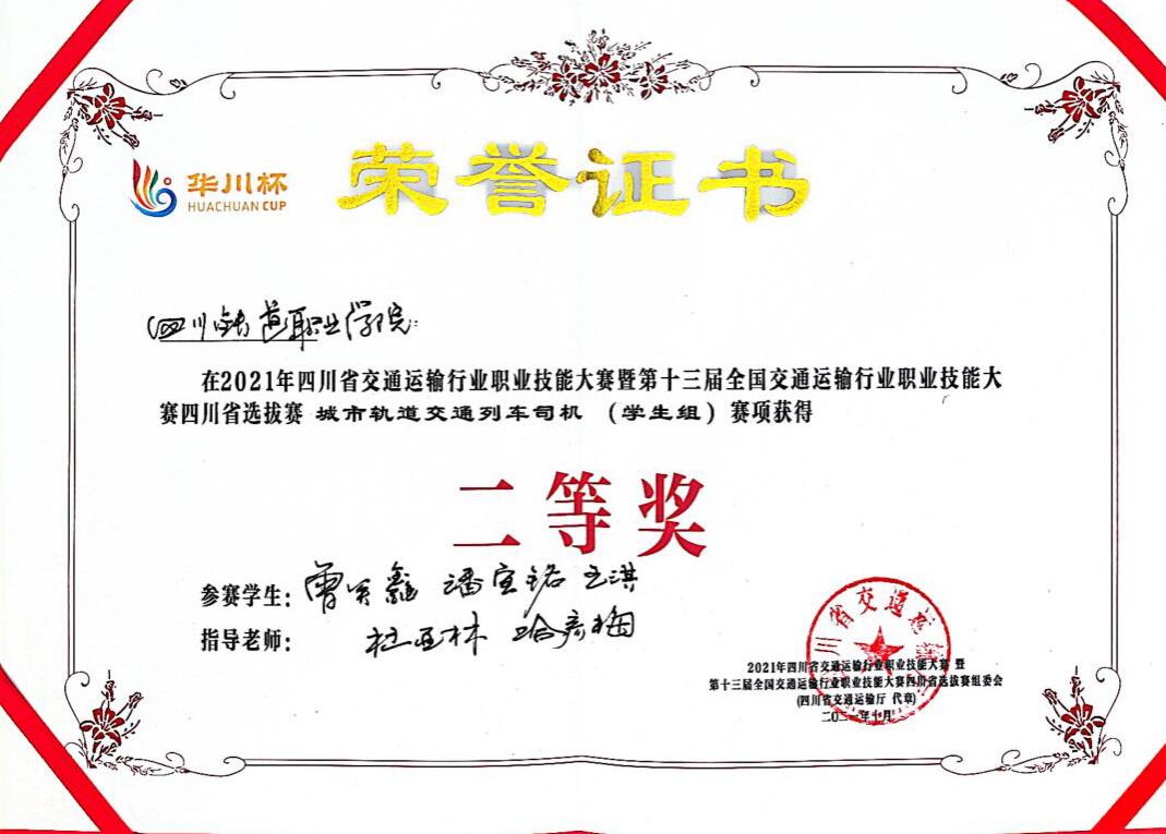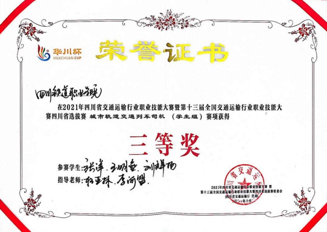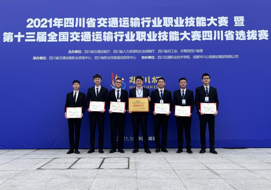 为大力弘扬劳模精神、劳动精神、工匠精神,10月25日至29日,2021年四川省交通运输行业职业技能大赛暨第十三届全国交通运输行业职业技能大赛“华川杯”四川省选拔赛,如期举行。beat365城市轨道交通学院6名学生参加城市轨道交通列车司机(学生组)赛项,学生组1队王淇、曾关鑫、潘宣铭,学生组2队张洋、王明垒、刘辉扬与四川省18支队伍激烈比拼。最终我院2支参赛队伍分别荣获省赛二等奖和三等奖,beat365获得优秀组织奖,并获得国赛参赛资格。