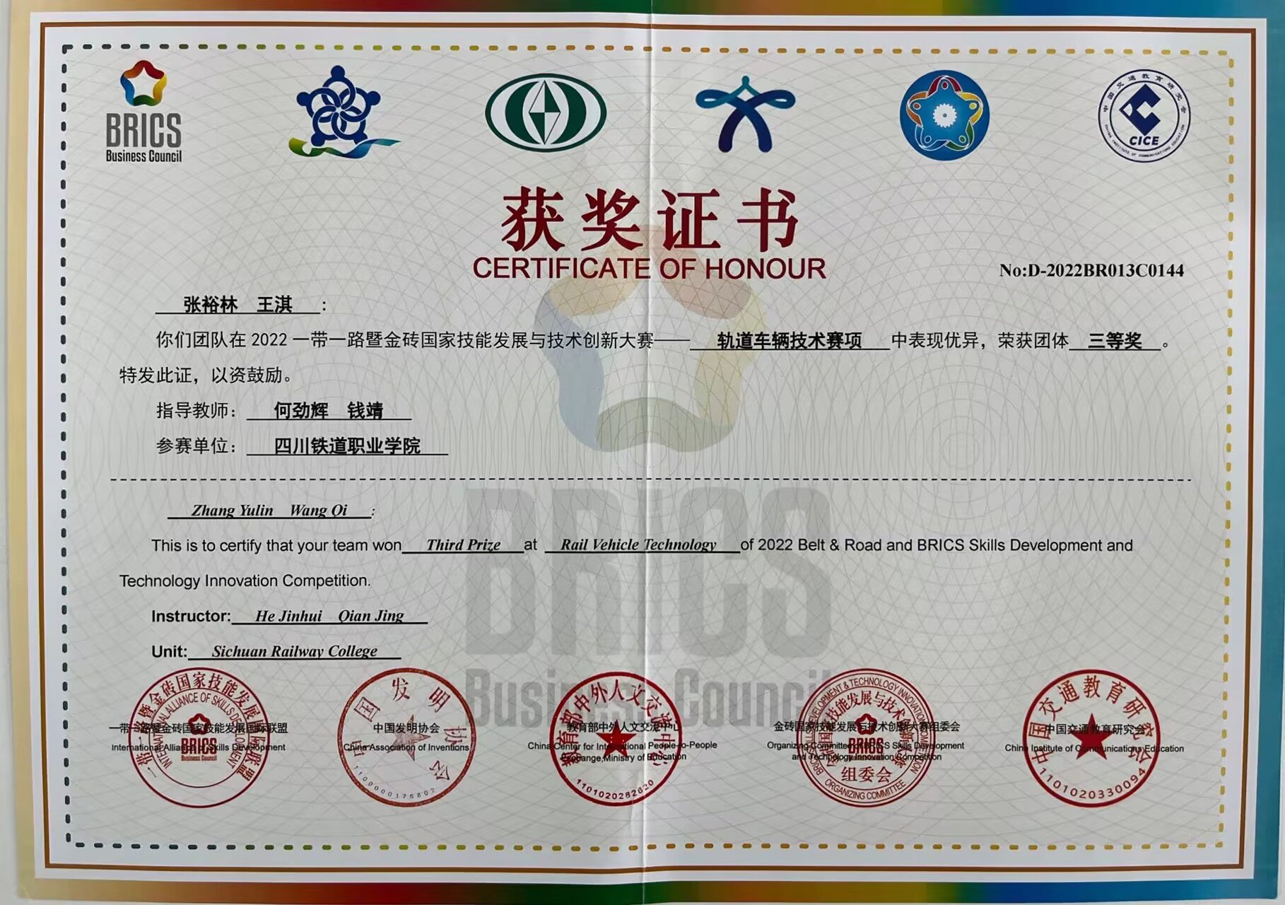 城市轨道交通学院参加2022年一带一路暨金砖国家技能发展与技术创新大赛之轨道车辆技术赛项,学院王淇、张裕林两位同学在国内比赛中获得全国三等奖,实现了beat365在该项比赛中的突破。