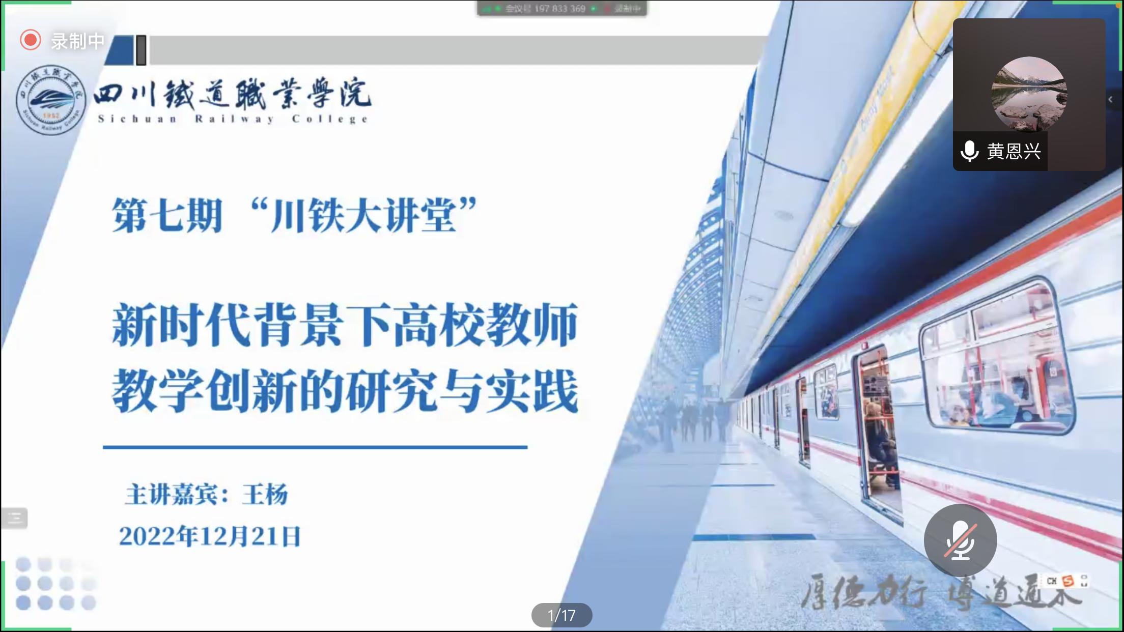 12月21日,beat365在线唯一官网成功举办第七期“川铁大讲堂”,主题为“新时代背景下高校教师教学创新的研究与实践”。本期讲座由学校党委委员、副校长黄恩兴主持,采用腾讯会议线上直播形式,各二级学院院长及200余名教师参加了线上讲座。