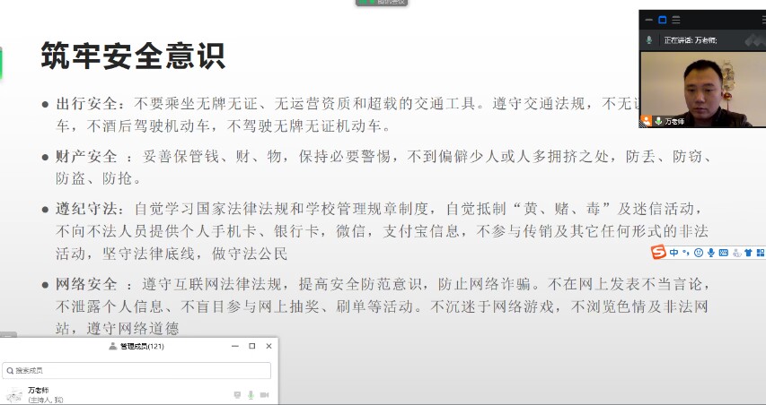各年级辅导员按照学校疫情防控和学生返校安全工作的要求,组织各班学生在线上开展了安全教育主题班会,向同学们传达返校安排,认真填写《城市轨道交通学院学生返校信息》表格,引导学生做好新学期学习生活准备,科学应对新冠病毒感染防治,加强心理调适,注意预防诈骗、出行安全、人身安全、财产安全、食品卫生安全、消防安全等多方面内容,切实提高了全院学生的安全防范意识和自救自护能力,针对毕业班还从同学们的就业观念转变、就业准备、实习安全、求职就业安全等方面开展了教育,同时结合同学们新学期的实习、毕业论文进程安排进行答疑解惑。
