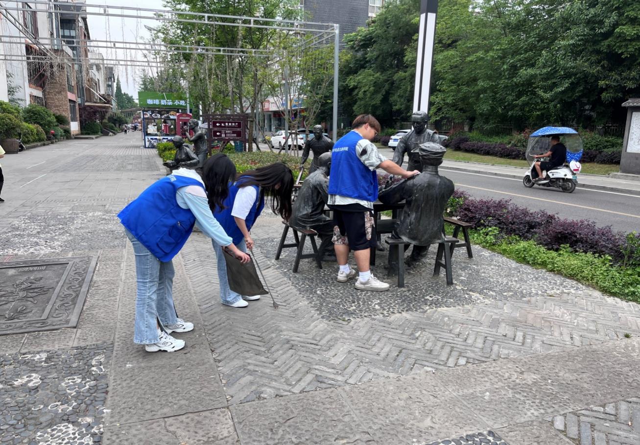五四的青春号角还在耳边萦绕,青春的梦想还在远方,但始终根植于脚下的土壤。安德作为中国川菜文化城,具有丰富的川菜文化印记。本次活动以安德川菜文化体验街为中心,将安德步行街道上的雕像、街面作为清洁目标。活动过程中,同学们自觉分配任务,撸起袖子,不怕脏,不怕累,发扬吃苦耐劳的劳动精神,圆满完成工作任务。