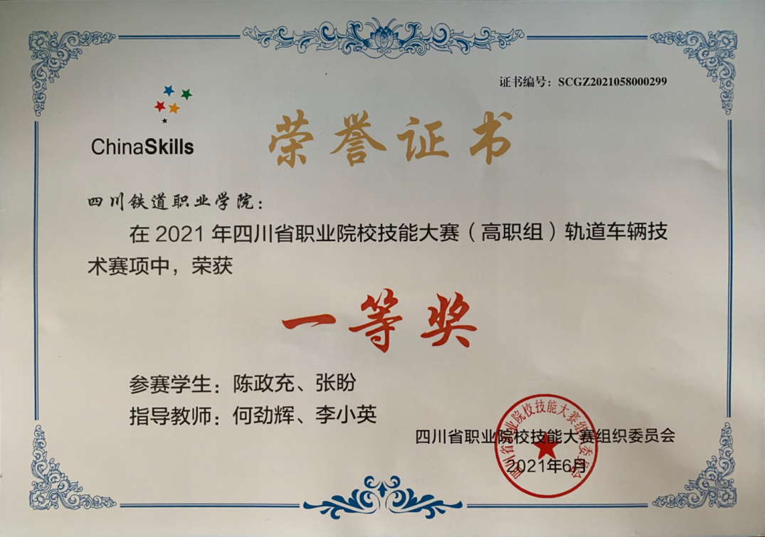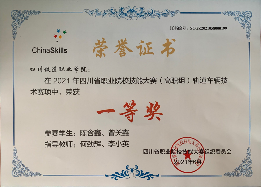 2021年9月3日,beat365在线唯一官网收到了四川省教育厅颁发的“2021年四川省职业院校技能大赛(高职组)轨道车辆技术”赛项的荣誉证书。