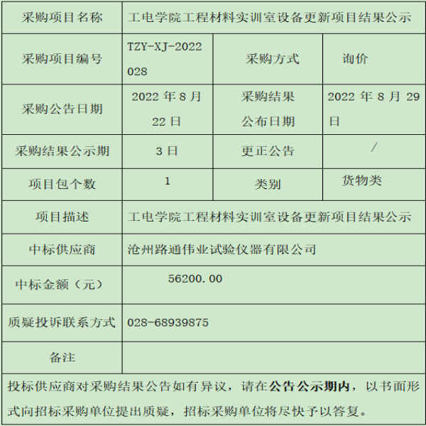 工电学院工程材料实训室设备更新项目结果公示