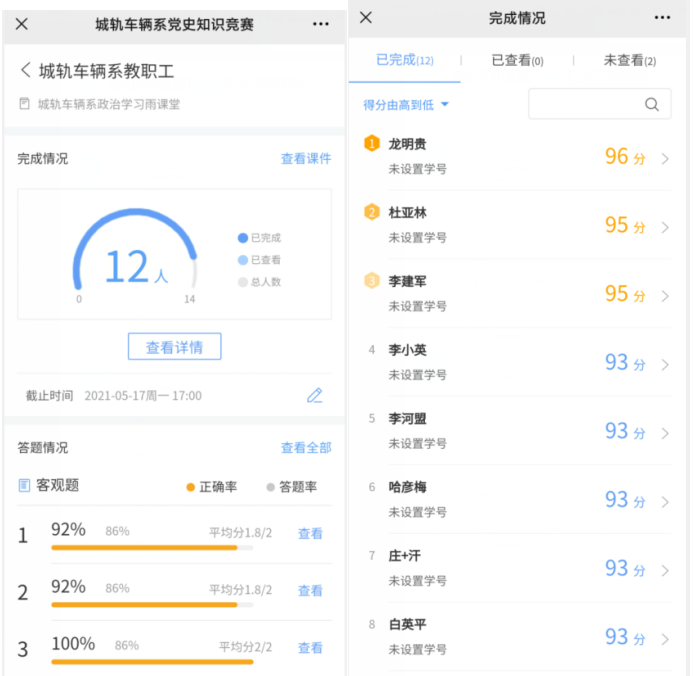 为庆祝中国共产党建党100周年,加强全体教职工对中国共产党的认识,城轨车辆系于2021年5月11日至2021年5月18日利用“雨课堂在线答题”的形式组织全体教职工参与党史知识竞赛。教职工们充分利用工作间隙,积极参与在线答题。