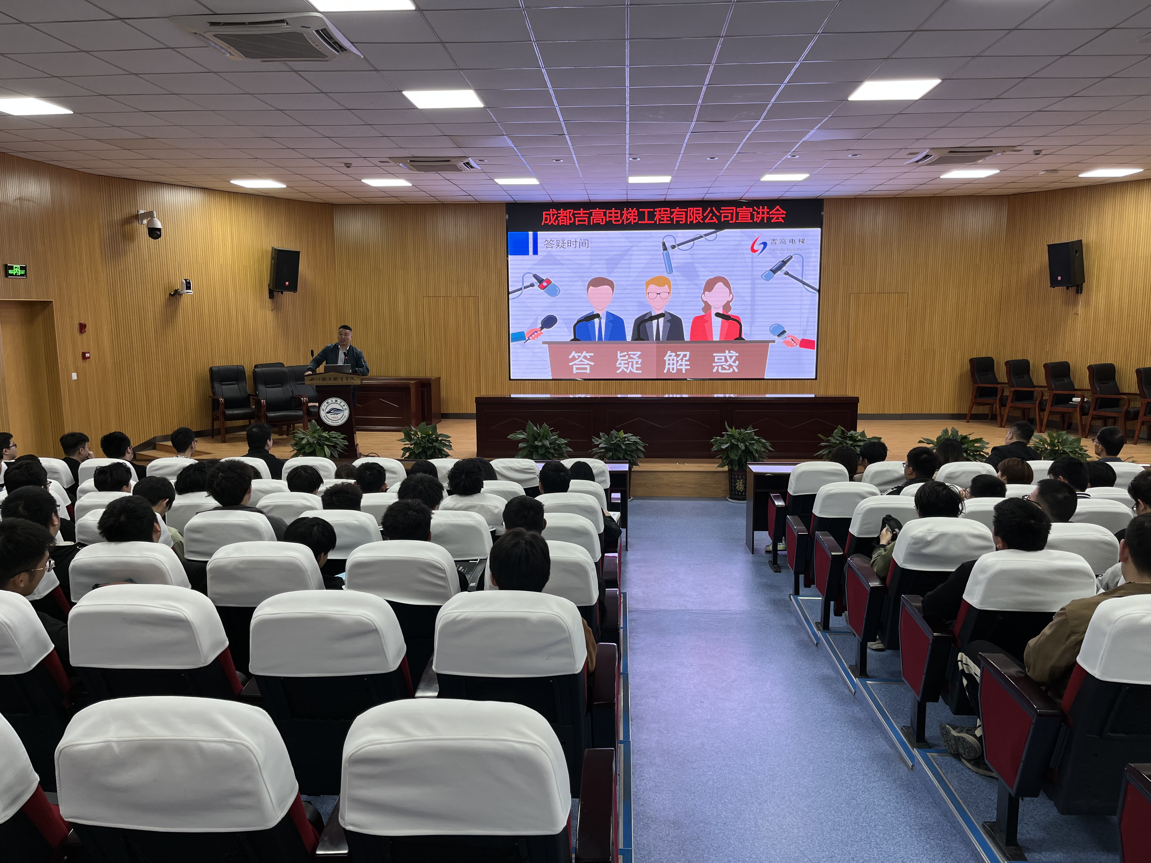 宣讲会上,三家电梯公司介绍了企业基本情况、岗位需求、职业发展、应聘要求等,并针对学生提出的问题进行解答。