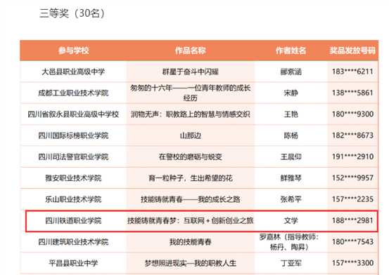 近日,由四川省教育厅指导、四川省教育融媒体中心(四川教育电视台)主办的“我的技能青春/我的职教人生”征文活动获奖名单公布。经济管理学院学子的作品从近千份来稿中脱颖而出,斩获2项奖项。其中,李陈睿、宋光钊、邓渝、唐万山、刘龙飞同学的作品《用行动选择热爱 以脚步践行理想》荣获二等奖,文学同学的作品《技能铸就青春梦:互联网+创新创业之旅》荣获三等奖。 据悉,“我的技能青春/我的职教人生”征文活动是2024年成渝地区双城经济圈职业教育活动周的子活动。活动自启动以来,便受到了全省职业院校师生和社会人士的广泛关注和踊跃参与。经初审、复审、专家评审,推选出一等奖10篇、二等奖20篇、三等奖30篇、优秀奖30篇。 近年来,学院认真贯彻落实《中华人民共和国职业教育法》,重视学生的全面发展,“以赛促学、以赛促创”,积极鼓励组织学生参加各级各类竞赛活动,此次获奖正是学院对职业教育进一步加强理论研究和实践创新的成果体现。