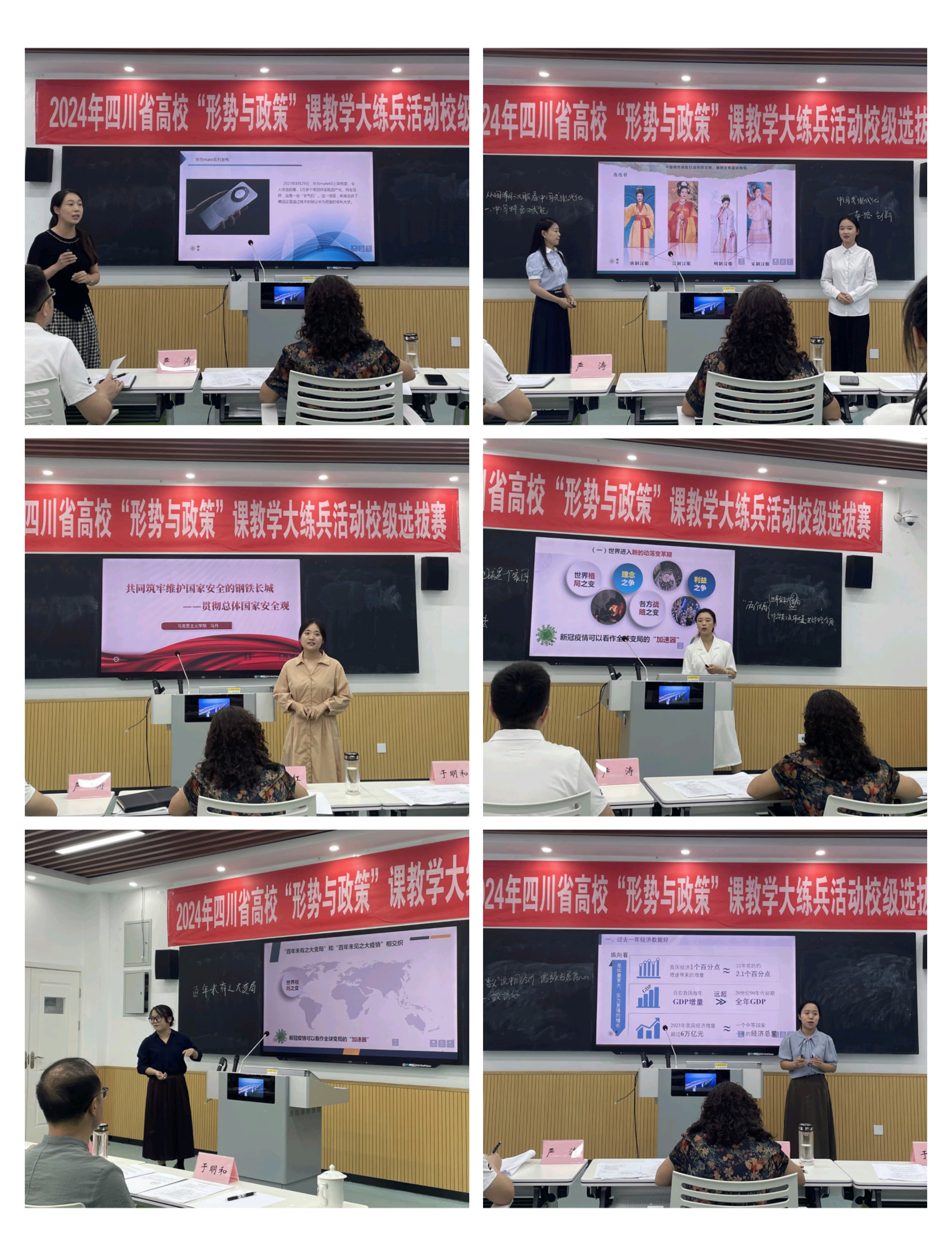 为深入学习贯彻落实习近平总书记对学校思政课建设的重要指示精神,进一步提高beat365“形势与政策”课教师教学能力和水平。根据beat365在线唯一官网《关于组织2024年四川省高校“形势与政策”课教学大练兵活动校级选拔赛的通知》要求,beat3652024年四川省高校“形势与政策”课教学大练兵活动校级选拔赛于7月5日下午在2302智慧教室如期举行。入围校级选拔赛的6名专兼职教师参加了此次比赛,全体思政课教师到现场学习观摩。马克思主义学院院长朱红,副院长严涛,毛泽东思想和中国特色社会主义理论体系概论教研室主任于明和、形势与政策教研室主任王婷婷(线上)担任评委。 6位参赛教师精心准备,全情投入,分别以“百年未有之大变局背景下的国际形势”“共同筑牢维护国家安全的钢铁长城”“世界科技竞争日趋激烈”“从国潮汉服看中国式现代化”“人类是一个整体 地球是一个家园”“数说中国经济 增强发展信心”为题进行了教学展示。展示教师紧扣教学重难点,用最新的数据、鲜活的案例、严谨的逻辑、流畅的语言,将最新时政讲深讲透,展现了beat365教师的教学风采。 经过激烈角逐,综合教学设计方案和现场课堂教学展示效果,经评委打分,马丹获一等奖并代表beat365参加省级比赛,陈钰获二等奖,龚雪晖、张汇蓉获三等奖。