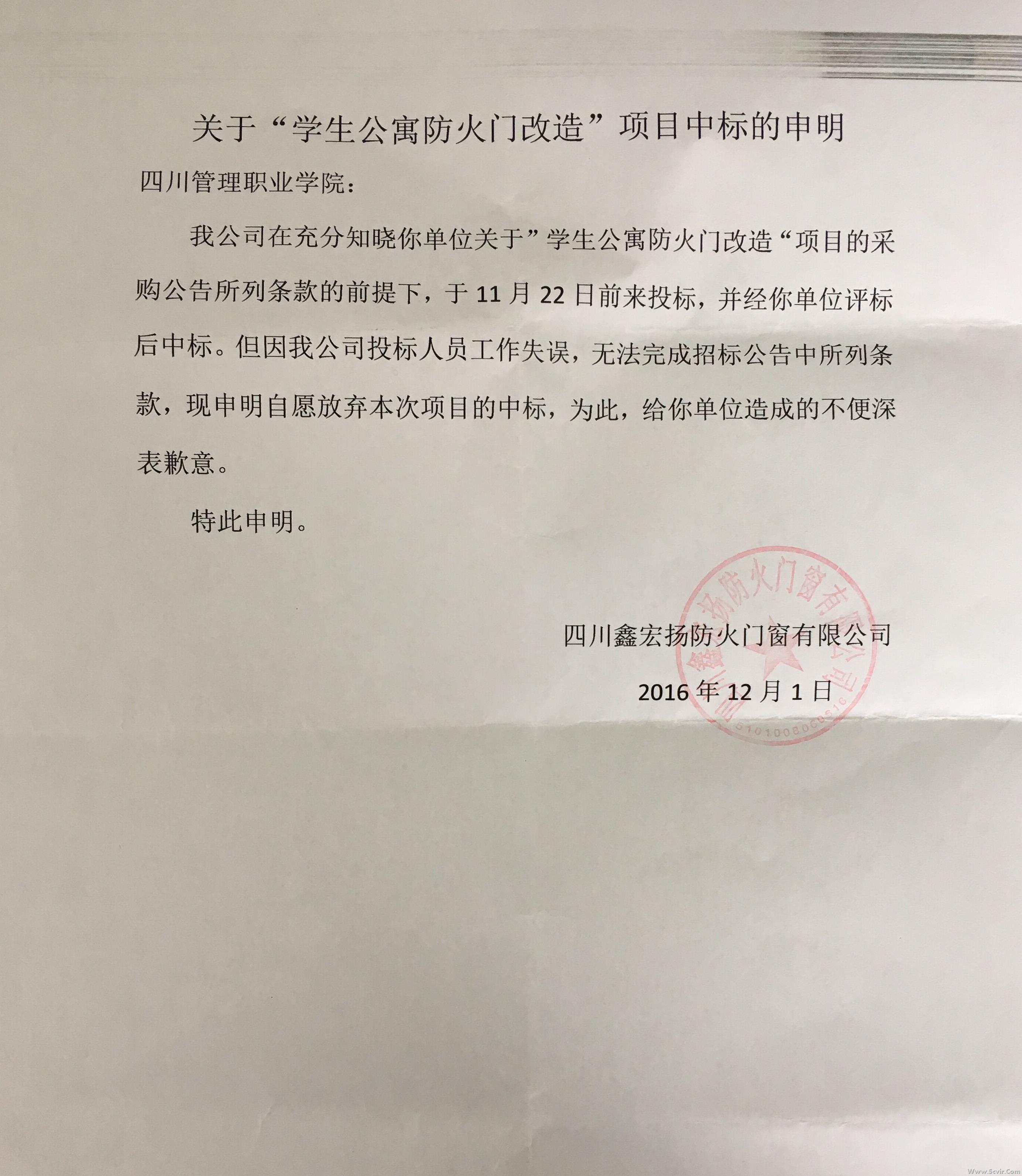 20161116日,我院在学院内网及外网上发布了“学生公寓防火门改造”项目的采购公告,于1122日下午2点在学院后勤处办公楼201室进行了开标。经院内评标委员会按照公告中明确的评审办法,对四家投标单位进行评选,确定:四川鑫宏扬防火门窗有限公司为第一名中标候选人,并将相关评选结果在学院内网及外网上进行了公示。公示期届满,最终确定四川鑫宏扬防火门窗有限公司为中标单位。但该单位在签订合同时,告之无法按照采购公告中所列条款完成采购项目,申明自愿放弃该项目(见附件)。根据《中华人民共和国政府采购法实施条例》的相关规定,现依顺序确定第二名中标候选人:成都铁牛门业有限公司为本次项目的中标人。