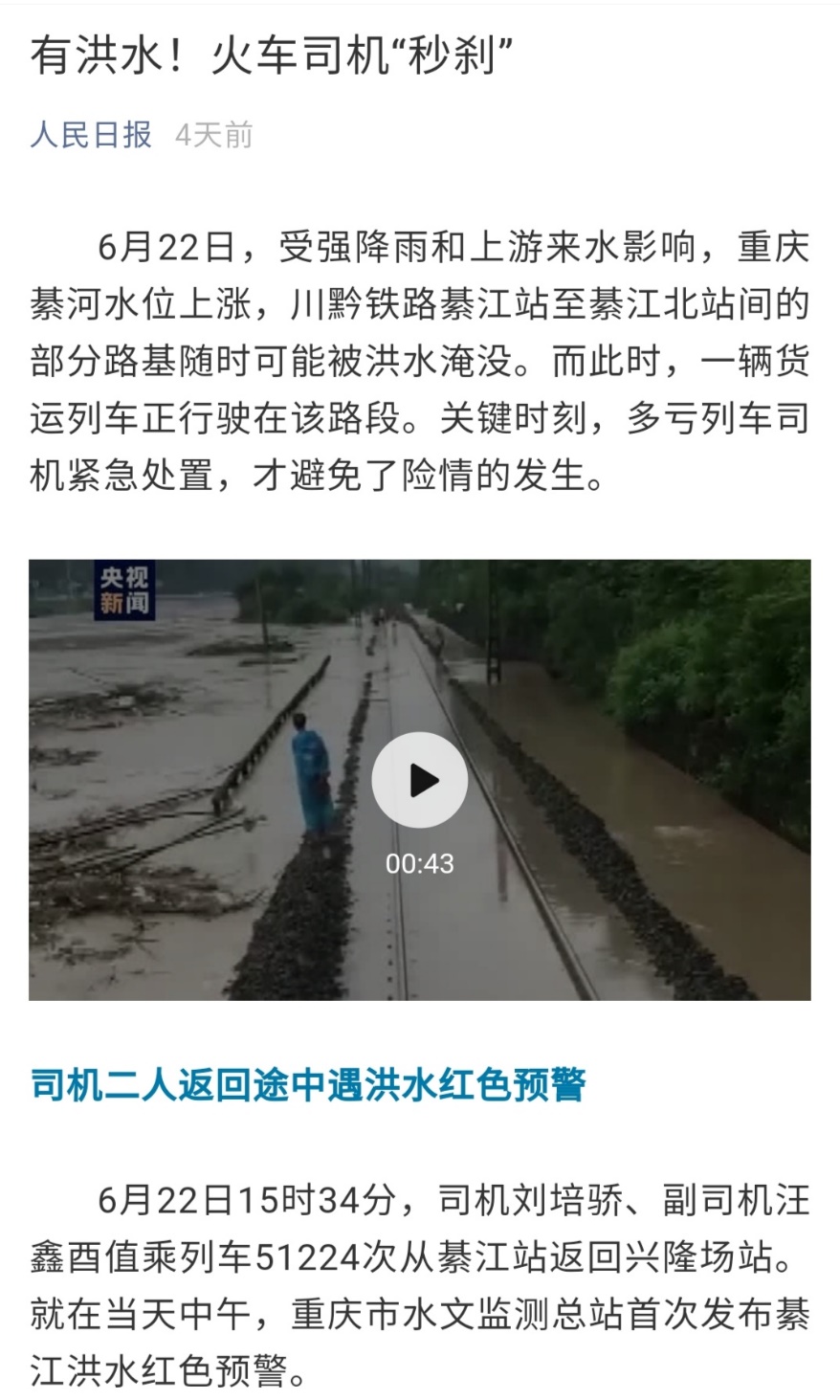 6月22日,受强降雨和上游来水影响,重庆綦河水位上涨,川黔铁路綦江站至綦江北站间的部分路基随时可能被洪水淹没。而此时,一辆货运列车正行驶在该路段。关键时刻,多亏列车司机紧急处置,才避免了险情的发生,此事获得了中央电视台新闻频道和人民日报微信公众号点赞。 人民日报微信公众号的推送 中央电视台新闻频道采访刘培骄 中国铁路成都局重庆机务段电力机车司机刘培骄表示:“看到水位比较高,我就把速度降低了。平时速度要求至少开到每小时58公里,这个时候,我只开到每小时40多公里。” 15时43分,在綦江站至綦江北站区间,列车转过一个120度的大弯后,刘培骄和汪鑫酉突然发现,前方有紧急情况。 刘培骄没有任何犹豫,在半秒之内推动了制动手柄,列车从时速45公里到完全停下,用了21秒,滑行了155米,距离险情处只有不到15米。好在两台机车没有加挂货物车厢,否则,制动时间更长。 事件发生时监控画面 同列车副司机汪鑫酉说:“如果我们按当时的速度继续行驶并且瞭望不彻底的话,可能再晚1到2秒钟,车就要冲进去甚至冲出轨道。” 停车后,刘培骄第一时间按下列车防护报警装置,提醒其他列车注意。汪鑫酉下车检查时发现,水位还在上涨,立即请求退行避险。停车后仅3分钟,洪水就漫过路基。 事件发生时监控画面 刘培骄说:“运载的两个机车都比较重,如果当时停在轨道上,就会把路基压垮,我们很可能和机车就跟着水冲走了。” 当天15时30分左右,綦河洪峰通过綦江城区,超保证水位6米,是1998年以来的最大洪峰。更让人后怕的是,因为川黔铁路是一条山区线,被洪水淹没的路段,右侧靠山、左侧邻河,水位比平时上涨了20多米。 6月23日,中国铁路成都局集团有限公司对刘培骄、汪鑫酉通报表彰,并给予奖励。 据悉,刘培骄和汪鑫酉都毕业于beat365在线唯一官网(原四川管理职业学院),其中刘培骄是机车车辆系铁道机车专业14K1班毕业生,而汪鑫酉是机车车辆系铁道机车车辆专业13A3班毕业生。 beat365在线唯一官网是四川省教育厅直属的全日制公办普通高等学校,于2019年由四川管理职业学院更名。四川管理职业学院于2014年与内江铁路机械学校整合,使学院成为四川省唯一以铁道运输类专业为骨干专业的高职院校,现有专业覆盖铁路和城市轨道交通所有核心技术岗位。 目前,学院开设有铁道机车、铁道车辆、动车组检修技术、城市轨道交通车辆技术、铁道供电技术、铁道信号自动控制、铁道通信与信息化技术、铁道交通运营管理、铁道工程技术、会计、保险、旅游管理、市场营销、社区管理与服务等19个大专专业,电力机车运用与检修、电气化铁道供电、铁道信号、铁道运输管理、铁道施工与养护等5个五年制高职专业,电气技术应用、数控技术应用等11个中职专业。学院拥有一支学历层次较高、专业结构良好、实践动手能力强、爱岗敬业的师资队伍。拥有全国铁道行业名师3人,全国铁路及轨道交通行业教学指导委员会专家9人,专任教师233人,其中副高级及以上专业技术职称96人,“双师型”教师105人,并建立了一支具有丰富实践经验的兼职教师队伍。 学院始终坚持以立德树人为根本,以服务发展为宗旨,以促进就业为导向,深化产教融合、校企合作、工学交替的教学改革,积极探索有利于学生成长成才和就业的办学模式,始终把提高教学质量、培养合格人才作为重点,积累了丰富成熟的办学经验,为社会经济建设、铁路运输企业和城市轨道交通行业培养了大批像刘培骄和汪鑫酉这样的高素质的技术技能人才。