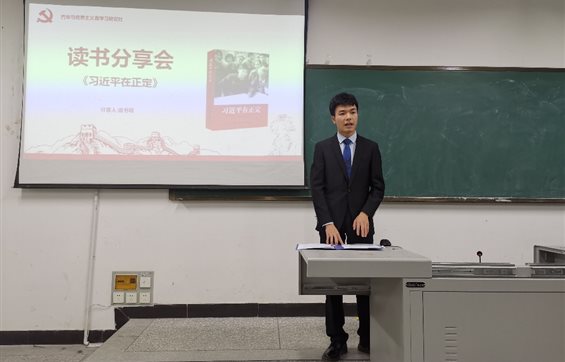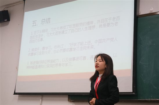 活动分为暑期“三下乡”马边社会实践分享、读书分享和全体大会三部分。首先是高盛宇同学就今年8月代表青马社参与校团委组织的为期一周的暑期“三下乡”马边社会实践活动进行了分享,他表示:很自豪能成为我院青马社的一员,“三下乡”马边社会实践活动让我深刻感受了国家对少数民族的惠民好政策,真切体会了精准扶贫给老百姓生活带来的崭新变化。最后,感慨地呼吁学弟学妹牢记习总书记提出的“把学习奋斗的具体目标同民族复兴的伟大目标结合起来,把小我融入大我,立志作出我们这一代人的历史贡献”,践行我院“厚德力行、博道通术”的校训,掌握专业知识,胸怀星辰大海,脚踏祖国土地。 机车18T4高盛宇进行分享 在读书分享会中,9位同学站上讲台,围绕《习近平在正定》《习近平的七年知青岁月》两书,以“不忘初心,砥砺前行”“习以为苦 勤以为常”“追伟人足迹,传承伟人精神”等为主题,从不同的角度和视野,结合PPT、以演讲的形式分享了自己的阅读思考与感悟。纷纷表示习总书记的成长历程是对“不忘初心、牢记使命”的生动诠释,让人灵魂得到洗礼、精神得到鼓舞、思想得到升华、学习得到启迪,我们将以习总书记为榜样,学习他“我将无我,不负人民”的忘我精神,以民族复兴为己任,提升本领,践行青年一代的使命当担。最后,龙燕老师对此次读书分享会作了点评,希望同学们通过此次活动有知识和精神层面的收获,不忘初心,坚守信仰。 在全体大会中,龙燕老师向全体成员宣读了青马社章程和制度,强调了青马社成立的宗旨,并对青马社成员表达了殷切期望,坚守初心,将有意义的事情做得有意思。