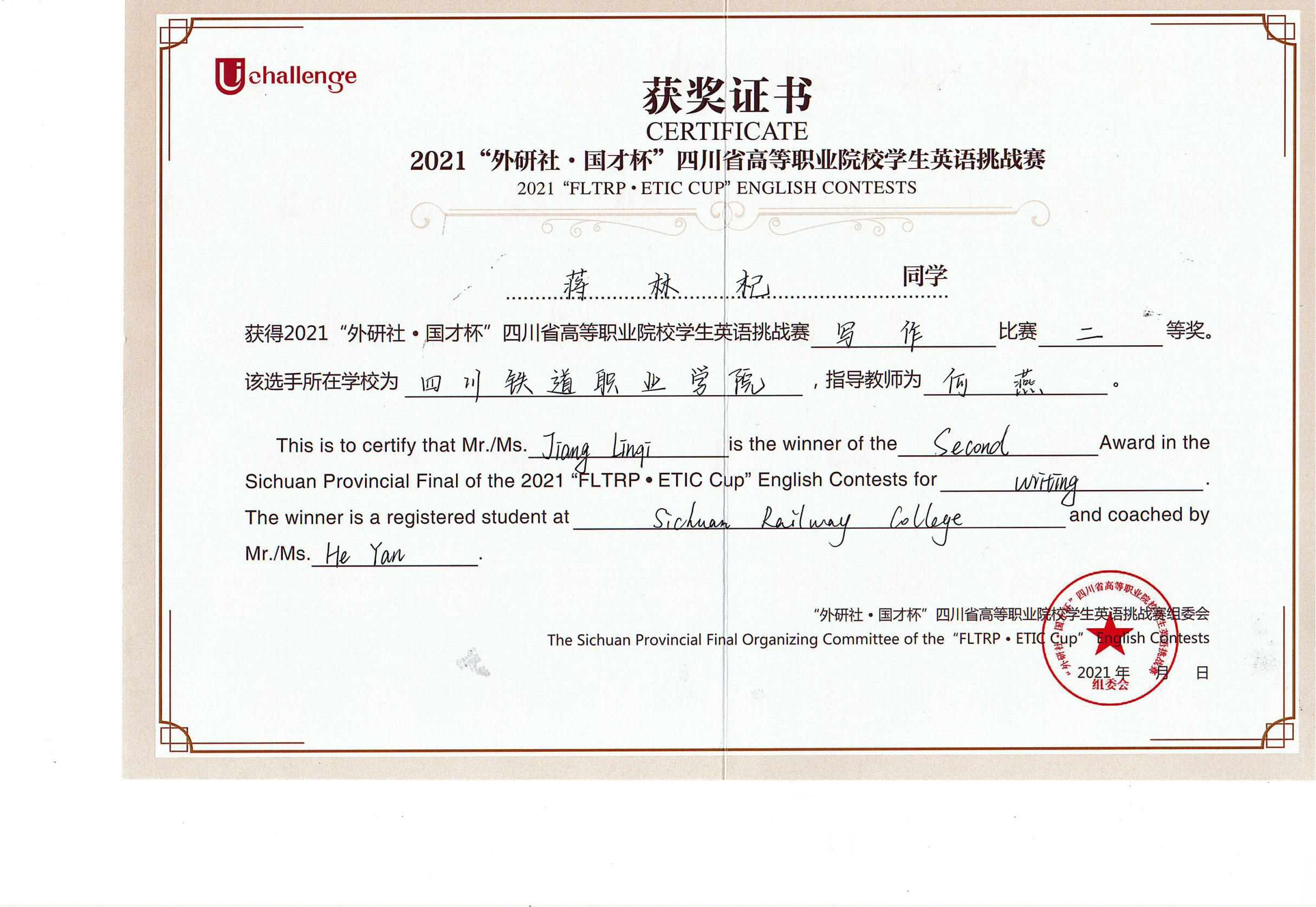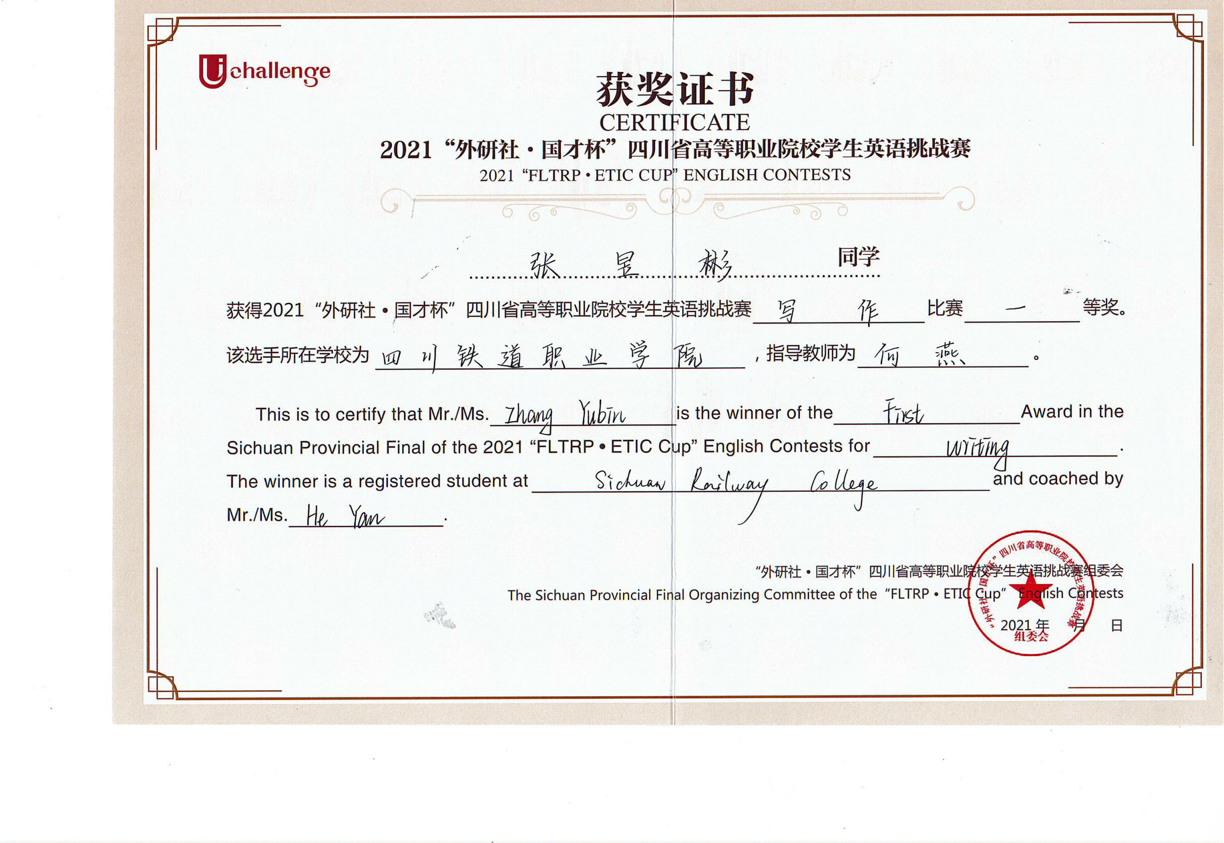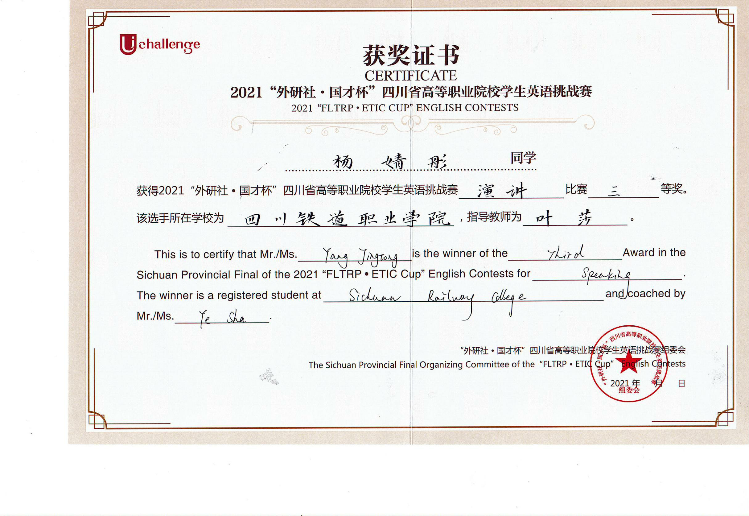 2021年10月30日至31日,由四川省教育厅主办,四川文化产业职业学院、外语教学与研究出版社承办的2021年UChallenge四川省高等职业院校学生英语挑战赛在四川文化产业职业学院隆重举行。经过激烈角逐,beat365铁道机车运用与维护21T1张昱彬获得写作大赛一等奖,铁道信号自动控制21T1蒋林杞获得写作大赛二等奖,铁道信号18A1杨婧彤获得演讲比赛三等奖。