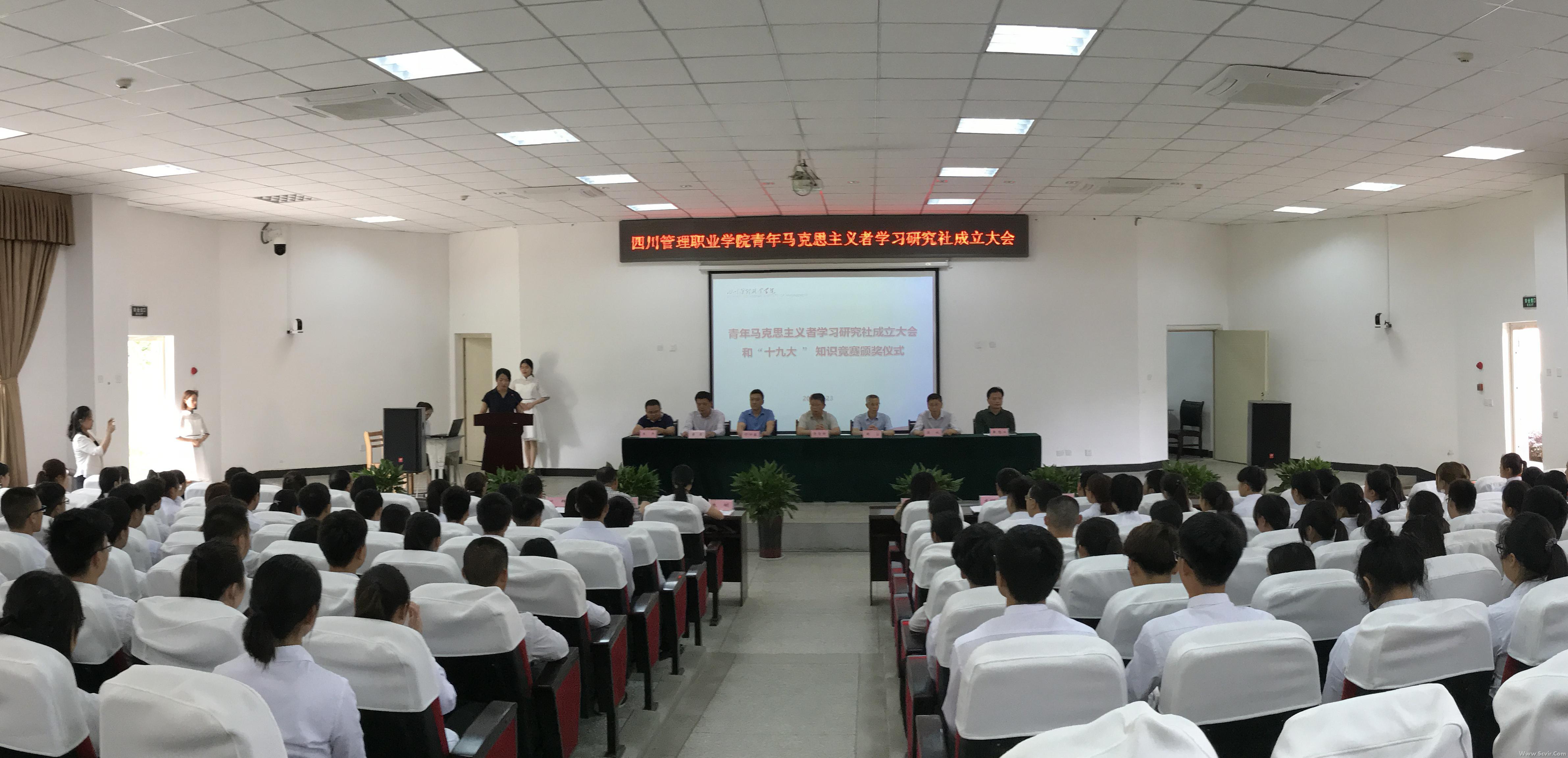 2018年5月23日,四川管理职业学院青年马克思主义者学习研究社成立大会在学术报告厅举行。院党委书记李青锋同志,院党委副书记、院长周立同志,院党委副书记、纪委书记舒怀春同志,院党委委员、副院长吴斌同志、黄勇同志,院党委委员黄恩兴同志、王平同志,和党办、团委等部门主要负责人、各系党总支书记、思政部全体教师出席,“青马社”全体成员和150余名学生代表参与大会。 李青锋同志在成立大会上致辞,对“青马社”的成立表示祝贺,并对“青马社”成员提出殷切希望。希望广大青年学生加强理论修养,坚定理想信念,做一名马克思主义的坚定拥护者;加强实践锻炼,坚持知行合一,做一名马克思主义的勇于实践者;争当先进模范,秉行不忘初心,做一名马克思主义的积极传播者。他强调,“青马社”的建设关系着青年学生的成长与发展,是学校的一项重要任务。学院上下要齐抓共建,全体指导老师认真指导,用马克思主义滋养和引领青年学生,使广大青年学生更加紧密地团结在以习近平同志为核心的党中央周围,坚定跟党走,成为担当中华民族复兴大任的时代新人。 周立院长为“青马社”颁发了牌匾。“青马社”聘请院党委成员,党办、学生处、团委、思政部主要负责人和各系党总支书记以及思政部教师担任指导教师。院团委书记朱俐同志宣读了指导教师名单,并核准青马社首届学生干部名单。纪委书记舒怀春同志为指导教师代表颁发聘书。郝毅然老师代表指导教师发言。青马社社长孙于涵同学代表学生发言。