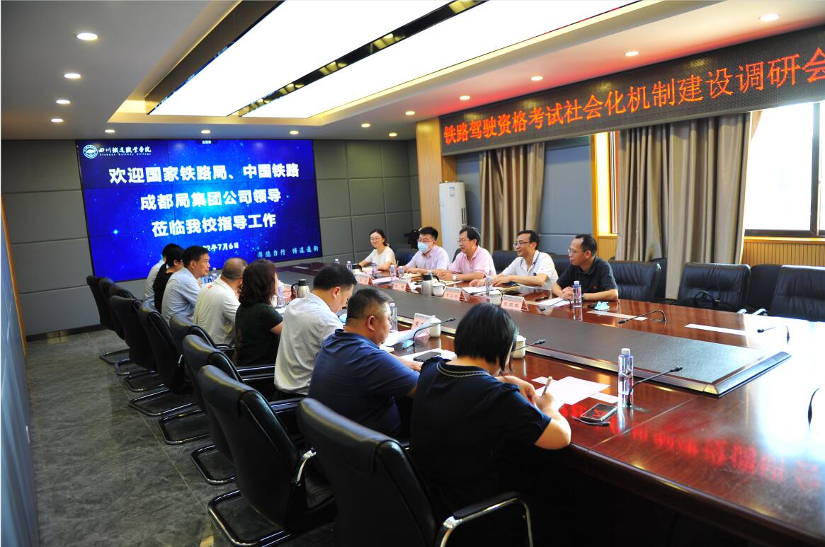 7月6日下午,国家铁路局铁路机车车辆驾驶人员资格考试中心祝曦处长、中国铁路成都局集团公司职工培训部张琪琳主任一行五人到beat365开展了驾驶资格考试社会化机制建设工作调研。 祝曦处长、张琪琳主任一行在学校党委书记贺兆轩、校长赖芳等陪同下,参观考察了学校铁道综合演练场、城轨交通综合实训中心、机车模拟操作系统等设施设备情况。