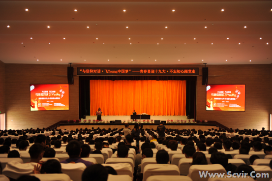 2017 年 9 月 27 日下午,学院大礼堂,为团结引领广大青少年听党话、跟党走,以奋发向上的精神状态迎接党的十九大,我院特邀《四川教育》杂志副主编李益众老师作了“‘与信仰对话·飞young中国梦’——青春喜迎十九大•不忘初心跟党走”讲座。讲座按照团中央的安排,在团省委和中国电信四川分公司的指导下,由院团委和三人行传媒集团股份有限公司承办,学院1200余名师生参加。 李益众老师首先逐字逐句解读了白岩松的作品《痛并快乐着》里的一段文字,分析了作者隐藏在平淡语言中的专注品质与处世之道。随后,李老师结合自身一路成长的经历,向同学们讲述了“勤奋”与“拼搏”的重要性,他怀揣着热情朝着目标奋斗的同时也见证和记录着我国砥砺奋进的岁月。他告诉同学们应诚实做人、踏实做事,要树立目标、勇于追梦。他以讲授写作小技巧为例,告诉同学们要多角度看待问题,在小事中学会成长。 李益众老师的演讲引起在场师生的共鸣,赢得热烈的掌声。