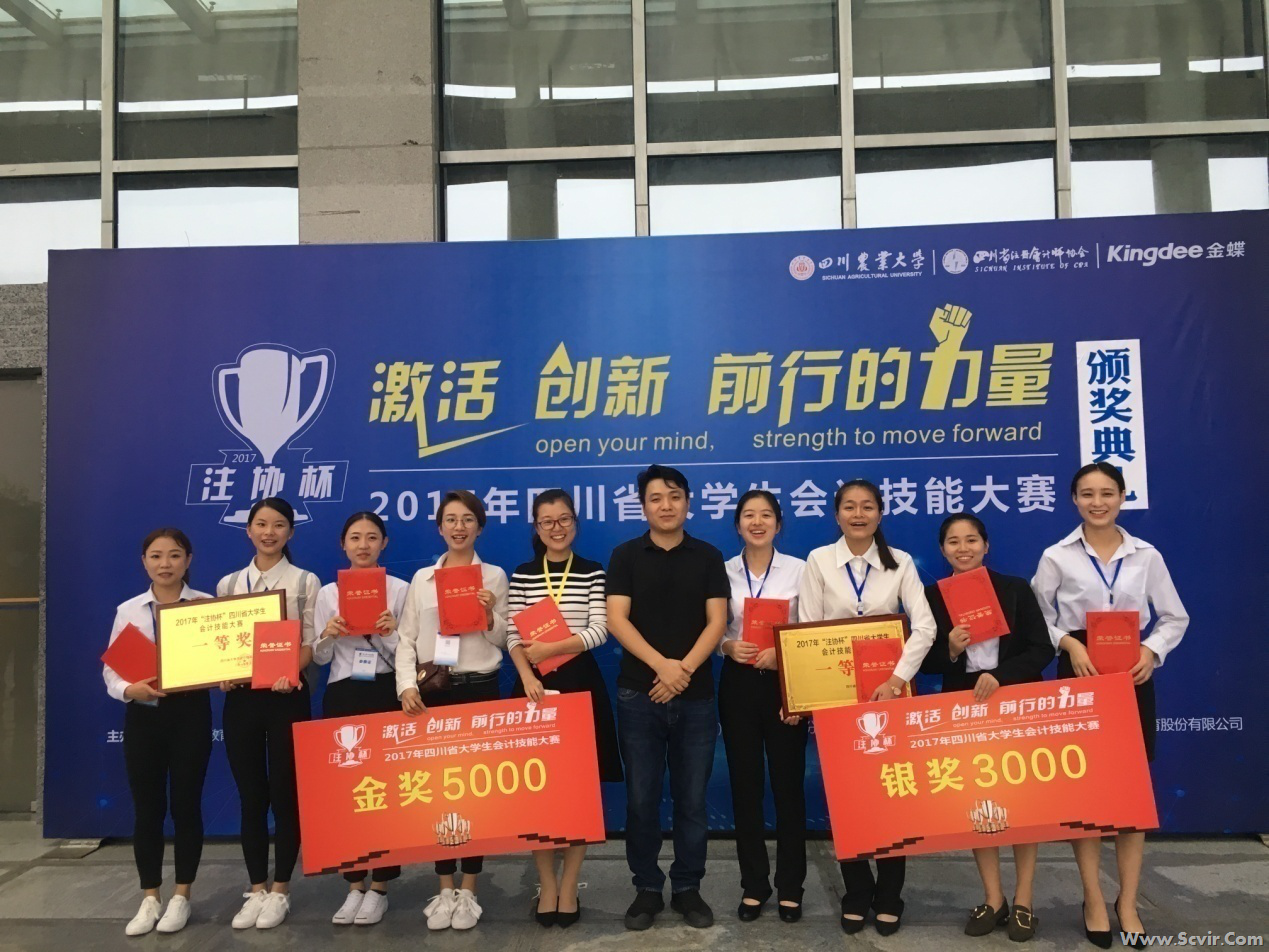 2017年9月22日,我院会计金融系代表队“天地一队”、“宇宙一队”参加了由四川省教育厅主办,四川农业大学承办,四川省注册会计师协会、金蝶软件(中国)有限公司成都分公司协办的2017年“注协杯”四川省大学生会计技能大赛。经过激烈角逐,我院会计金融系祝瑾老师指导的“天地一队”(队员:文璟、卢曦、吴庆玲、程冰瑶)和廖星煜老师指导的“宇宙一队”(队员:张梦丹、王茜、李炳杉、尹钏蓉),不负众望,分别得专科组第一名、第二名的佳绩,斩获一等奖金奖、一等奖银奖。
