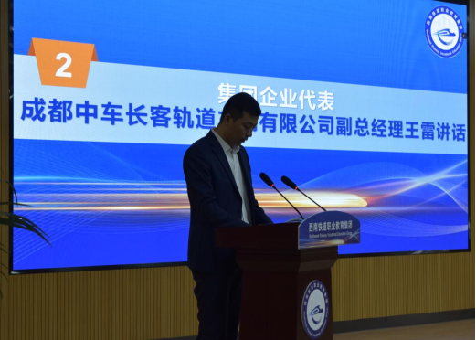成都中车长客轨道车辆有限公司副总经理王雷,作为集团成员企业代表发言。他向集团成员简要介绍了企业情况与发展愿景,回顾与beat365在线唯一官网校企合作、产教融合的历史,对beat365在线唯一官网的人才培养质量给予了高度肯定。他说,作为西南铁道职业教育集团的理事长单位之一,成都中车常客轨道车辆有限公司将恪守集团章程,愿与集团内教育成员单位一起打造校企共育、产教融合新高地,在力所能及的情况下,帮助学校改善办学条件,第一时间提供人才需求计划和人才培养要求的。他坚信在二十大精神的指引下,西南铁道职业教育集团,必将引领铁道职业教育的发展,必将促进西南地区轨道交通职教资源共建共享,必将成为建设轨道交通技术技能人才培养高地,必将在服务交通强国,川藏铁路建设,成渝双城经济圈、“一带一路”倡议等国家重大战略实施的大潮中作出新的贡献。