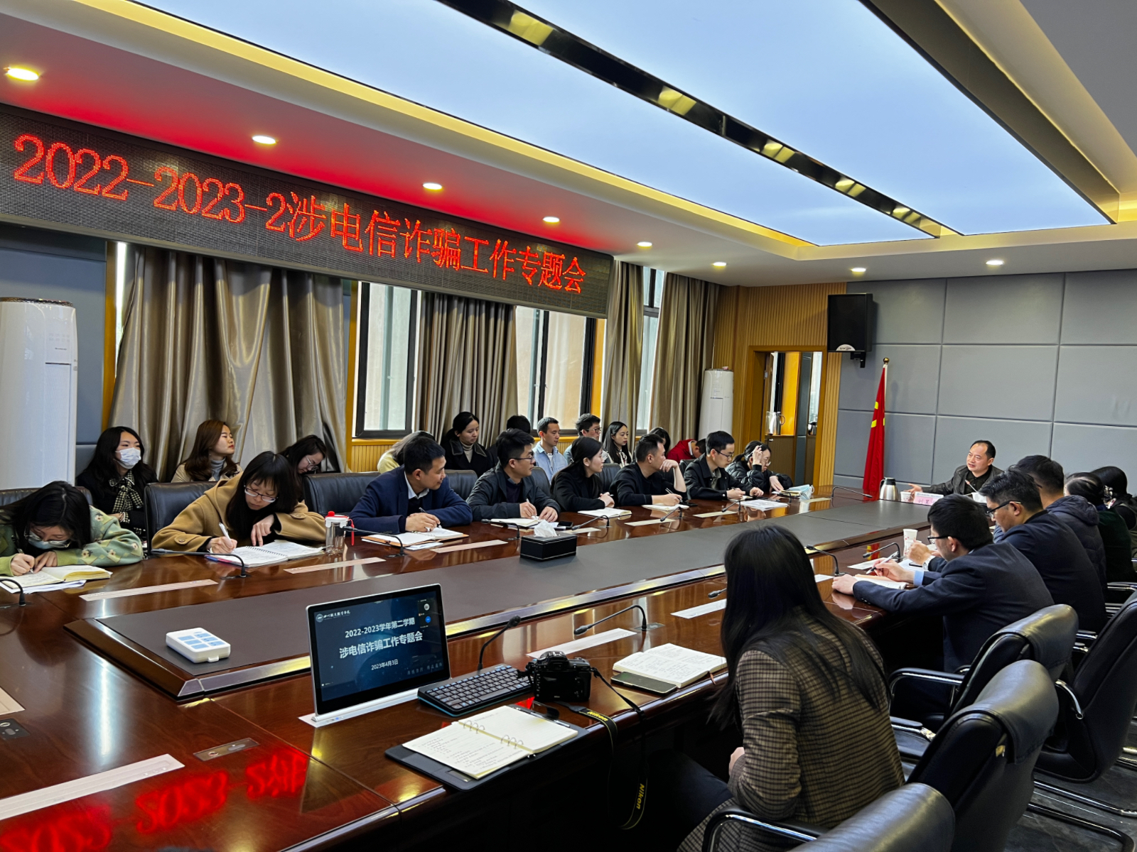 为加强平安校园建设,提高广大师生识骗防骗能力,遏制学生涉电信网络诈骗案件的发生,4月3日上午,学校在第五会议室召开学生群体涉电信诈骗专题会议,深入分析当前面临的严峻形势,安排部署下一步工作。会议由党委副书记刘昊君主持。