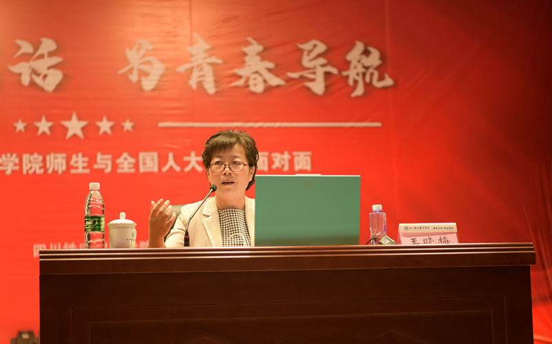 为推动学习贯彻全国“两会”精神走深走实,4月17日下午,十四届全国人大代表、眉山市青神中学副校长王晓梅应邀来校开讲。党委副书记刘昊君主持报告会,1600余名师生代表通过线上线下相结合的形式聆听了报告。