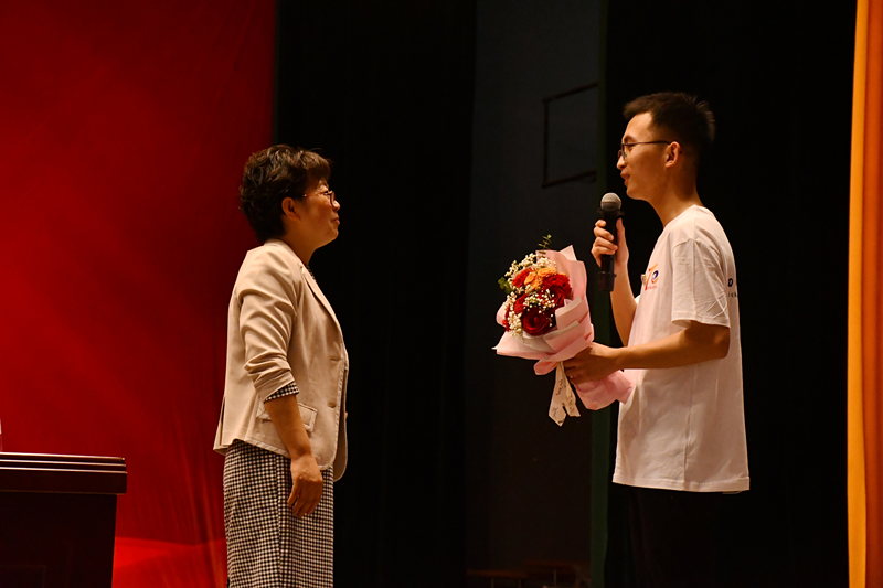 报告结束后,学生代表雷云杰(原青神中学毕业生)向王晓梅校长献花。