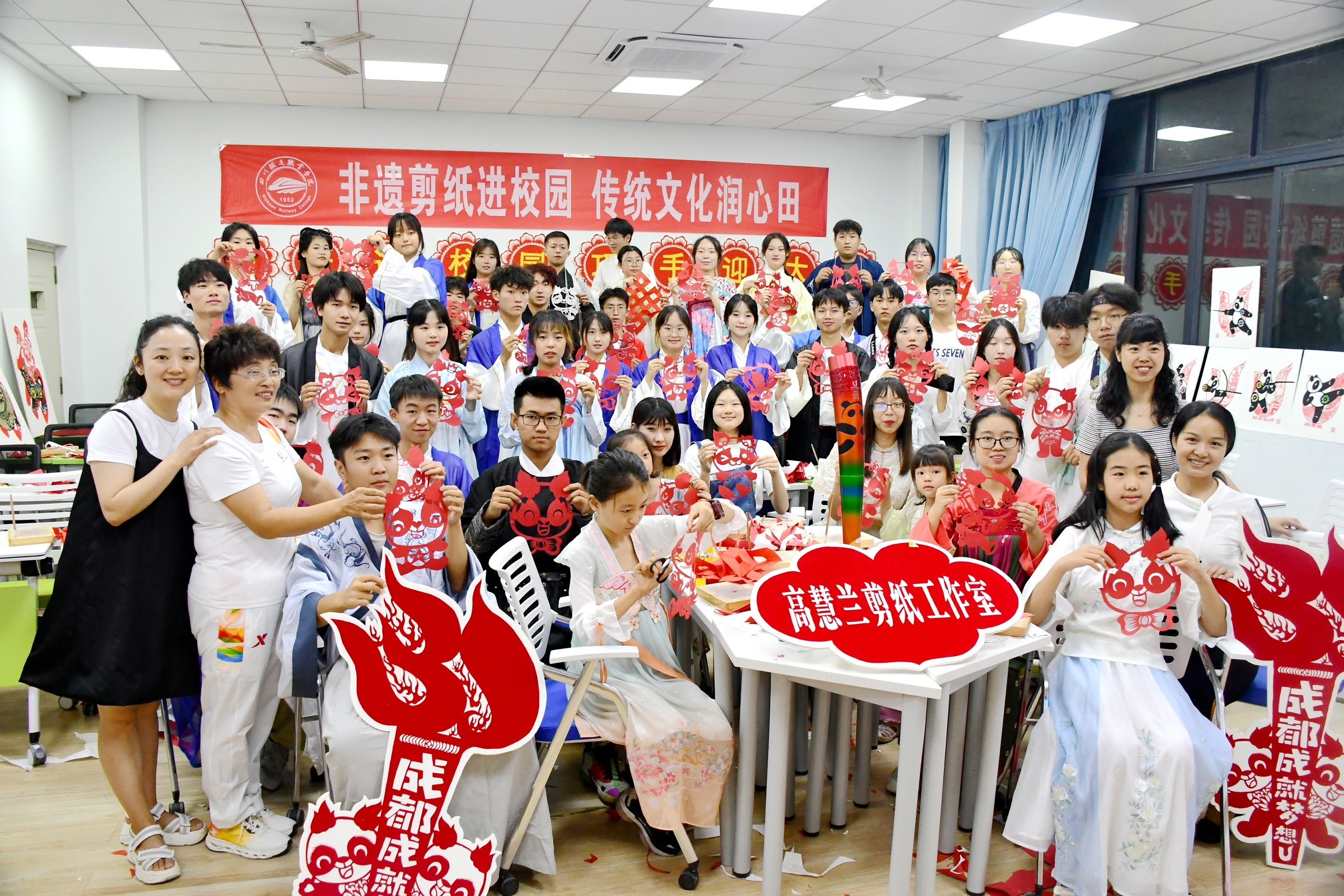为传承中华优秀传统文化,继承和发扬民间剪纸艺术,让学生认识“非遗”、了解“非遗”、传承“非遗”,宣传大运、助力大运,6月29日晚上,学校特邀请第31届世界大学生夏季运动会火炬手、非遗传承人高慧兰助力学校“第二课堂”,结合全民喜迎大运主题,通过非遗剪纸的形式,在学校教学楼1211教室上了一堂趣味横生的手工剪纸课,50余名师生代表参加此次活动。