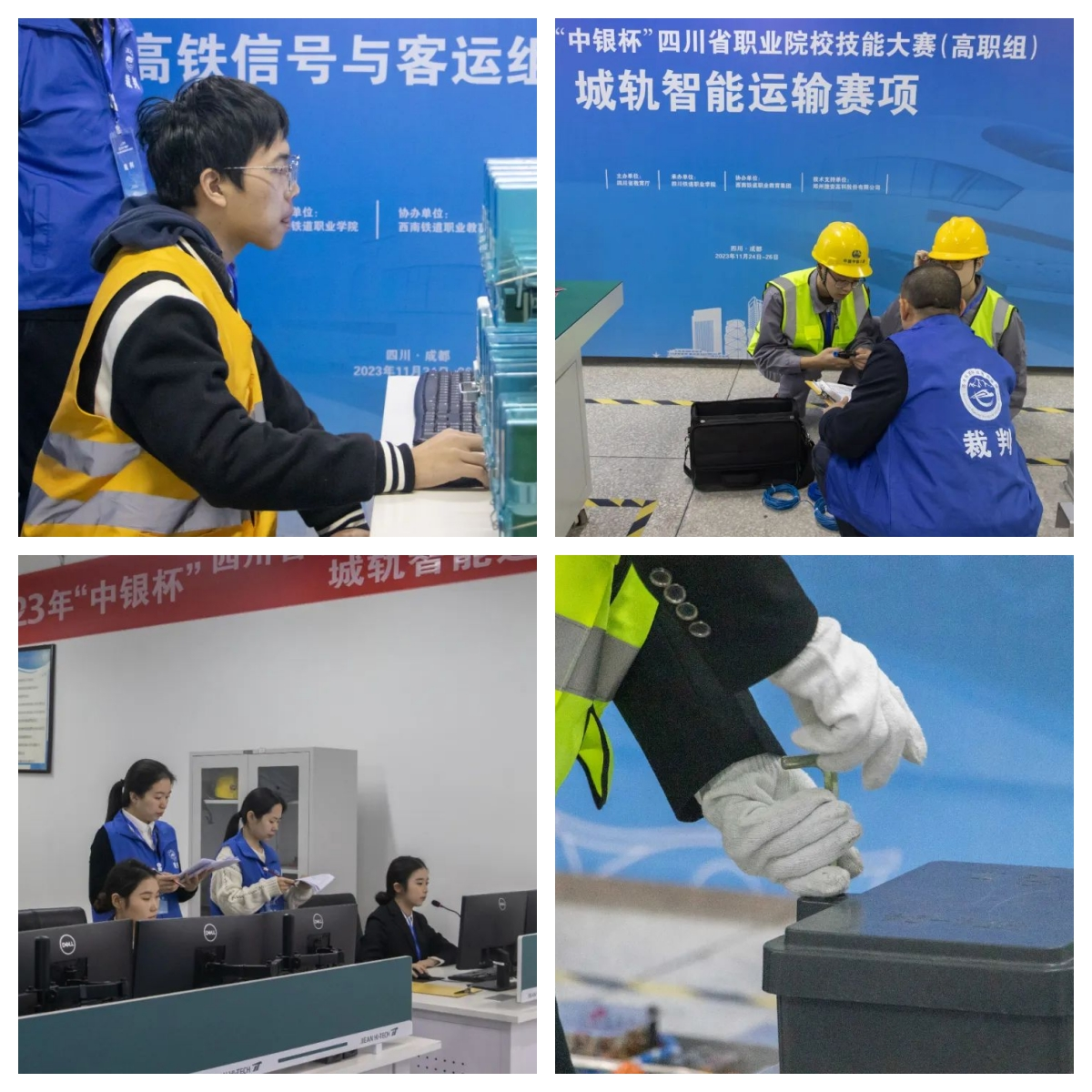 为深入学习贯彻党的二十大精神和习近平总书记关于技能人才工作的重要指示精神,落实党中央国务院、省委省政府关于加强技能人才队伍建设的决策部署,加快培养和选拔交通运输与装备制造领域高素质技能人才,大力弘扬劳模精神、劳动精神、工匠精神,11月24日至26日,2023年“中银杯”四川省职业院校技能大赛(高职组)城轨智能运输赛项和高铁信号与客运组织赛项在beat365在线唯一官网顺利举行。本次比赛由四川省教育厅主办,beat365在线唯一官网承办,西南铁道职业教育集团协办。来自四川交通职业技术学院、四川邮电职业技术学院、成都工贸职业技术学院等16所高职院校的44支代表队在2个赛道同台竞技。