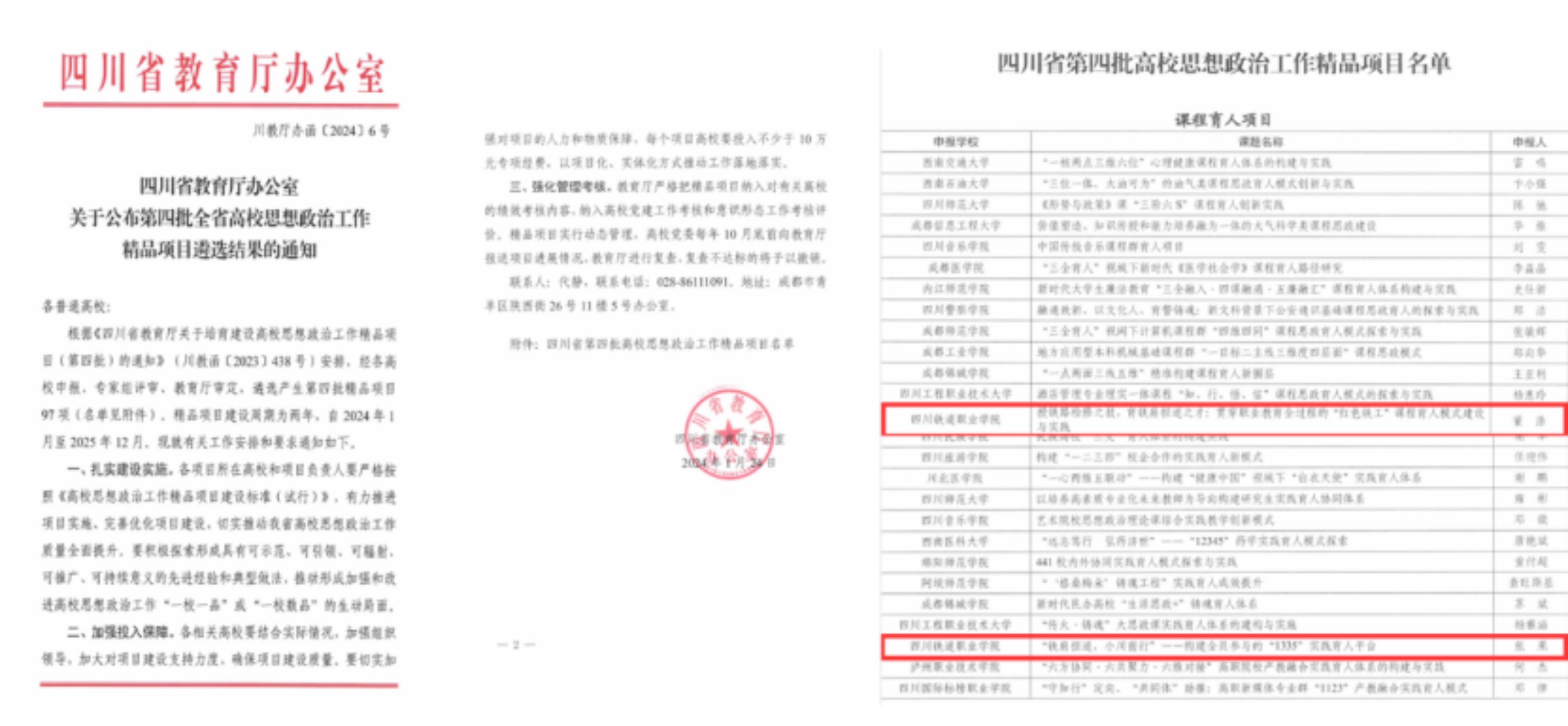 近日,四川省教育厅公布了全省第四批高校思想政治工作精品项目名单,beat365张果团队申报的《“铁肩担道,小川前行”--构建全员参与的“1335”实践育人平台》(实践育人项目)、董浩团队申报的《授铁路检修之技,育铁肩担道之才:贯穿职业教育全过程的“红色铁工”课程育人模式建设与实践》(课程育人项目)成功入选。