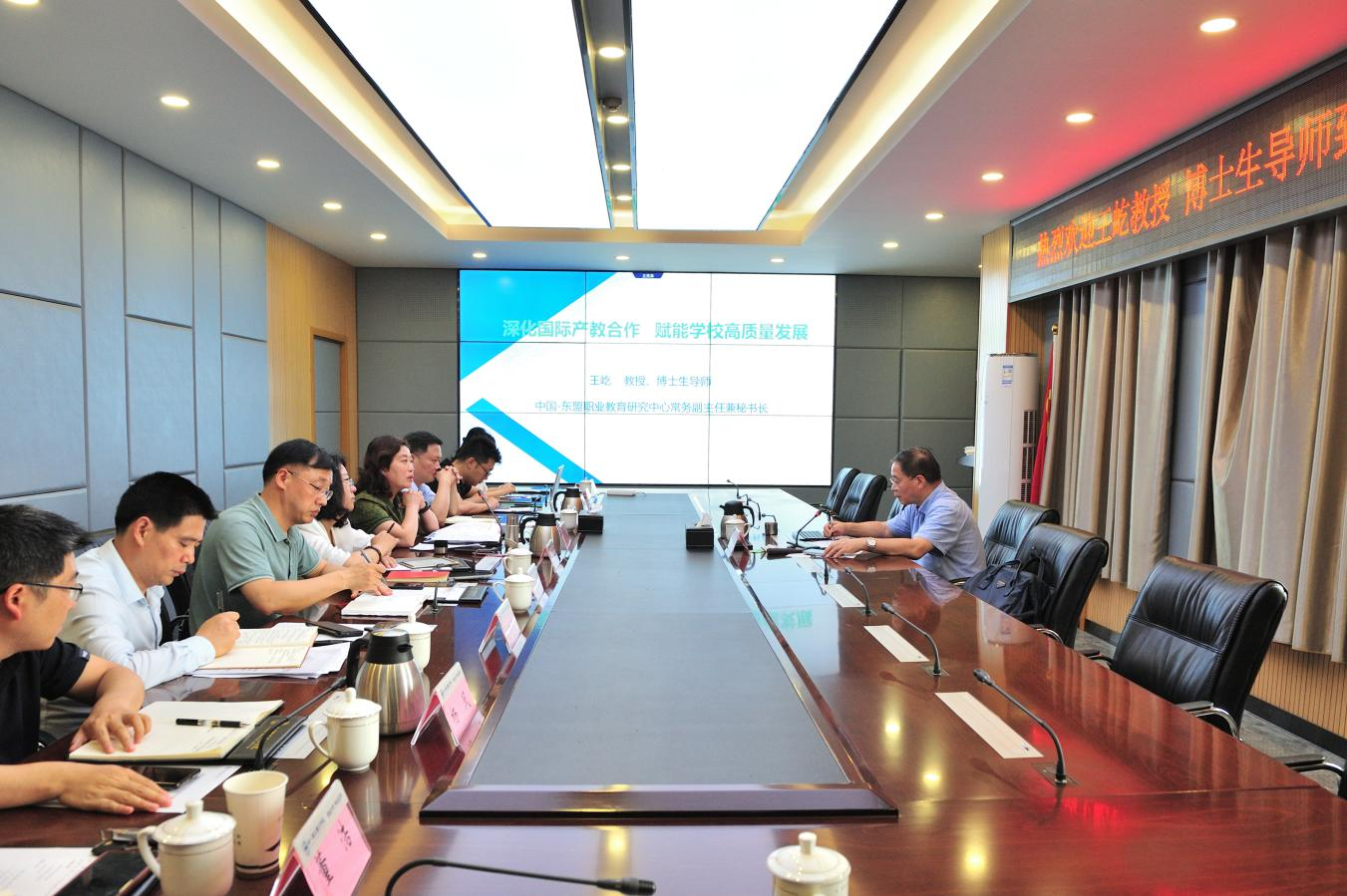 6月6日,中国-东盟职业教育研究中心常务副主任兼秘书长王屹教授受邀来校指导国际交流与合作领域相关工作,并以“深化国际产教融合、赋能学校高质量发展”为题作专题辅导。专题辅导会前,党委书记贺兆轩会见了王屹教授。校长赖芳主持会议。