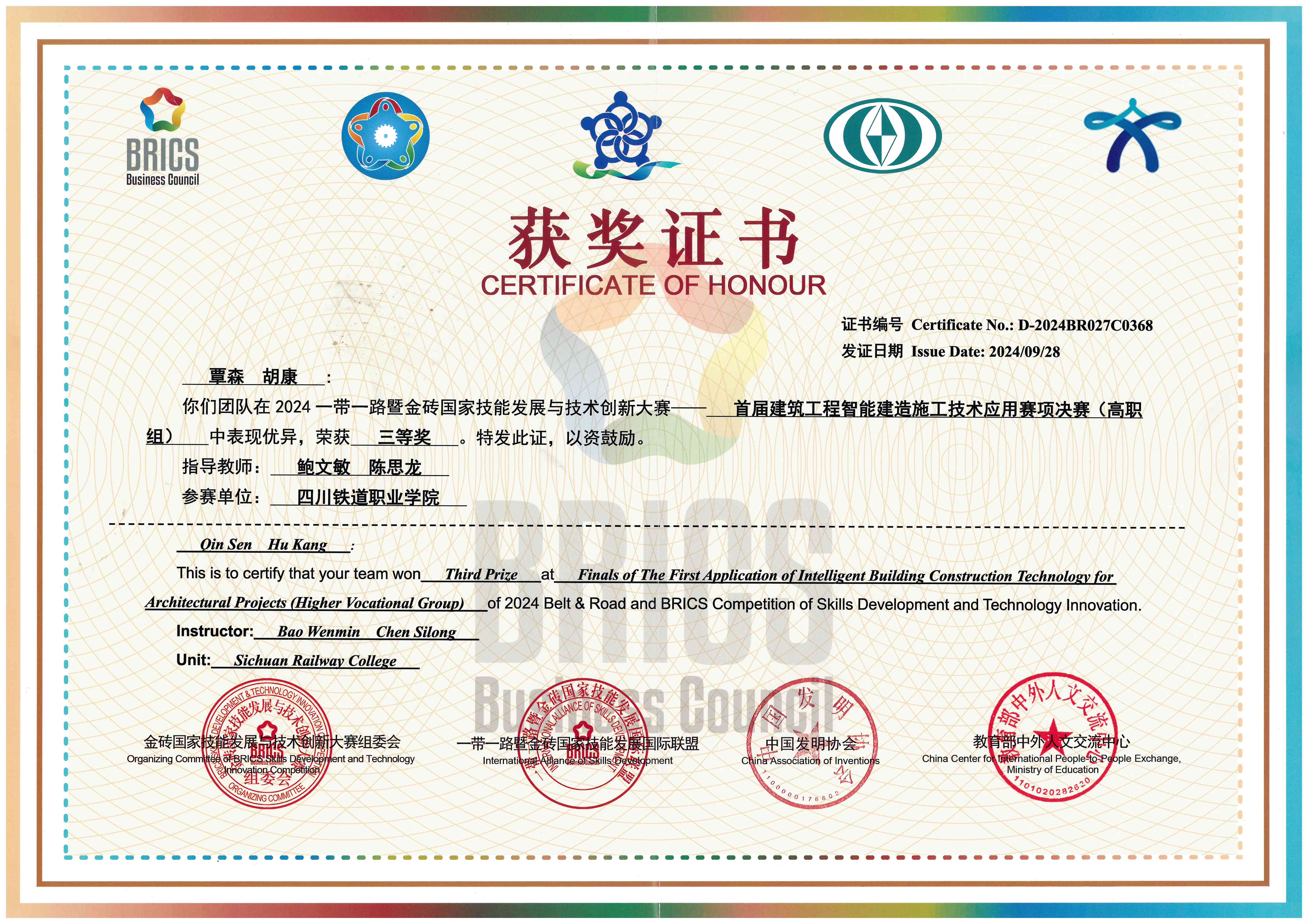 2024年9月26至28日,2024一带一路暨金砖国家技能发展与技术创新大赛首届建筑工程智能建造施工技术应用赛项(BRICS-ST-027)全国总决赛在浙江杭州举行。学校铁道工电学院覃森、胡康学生团队荣获全国总决赛三等奖。 一带一路暨金砖国家技能发展与技术创新大赛是经金砖国家最高领导人会晤筹备委员会认可、中华人民共和国外交部备案、金砖国家工商理事会批准的国际大赛。大赛主要以智能制造、先进制造等技能为核心,关注未来技能人才培养,是推动金砖国家间教育合作、技能开发和人文交流活动的重要平台。建筑工程智能建造施工技术应用赛项以建筑工程施工前沿技术技能应用为主题,结合“双碳”目标与产业绿色转型发展趋势,综合考察选手的建筑施工技术、创新实践等能力。此次全国总决赛汇聚了来自全国超过200所院校的282支精英队伍,他们围绕智能建造技术、建筑工程碳计算等应用与实践领域进行技术交流切磋、激烈对决。beat365参赛队伍凭借卓越的创新思维和精湛的技术实力荣获全国三等奖。