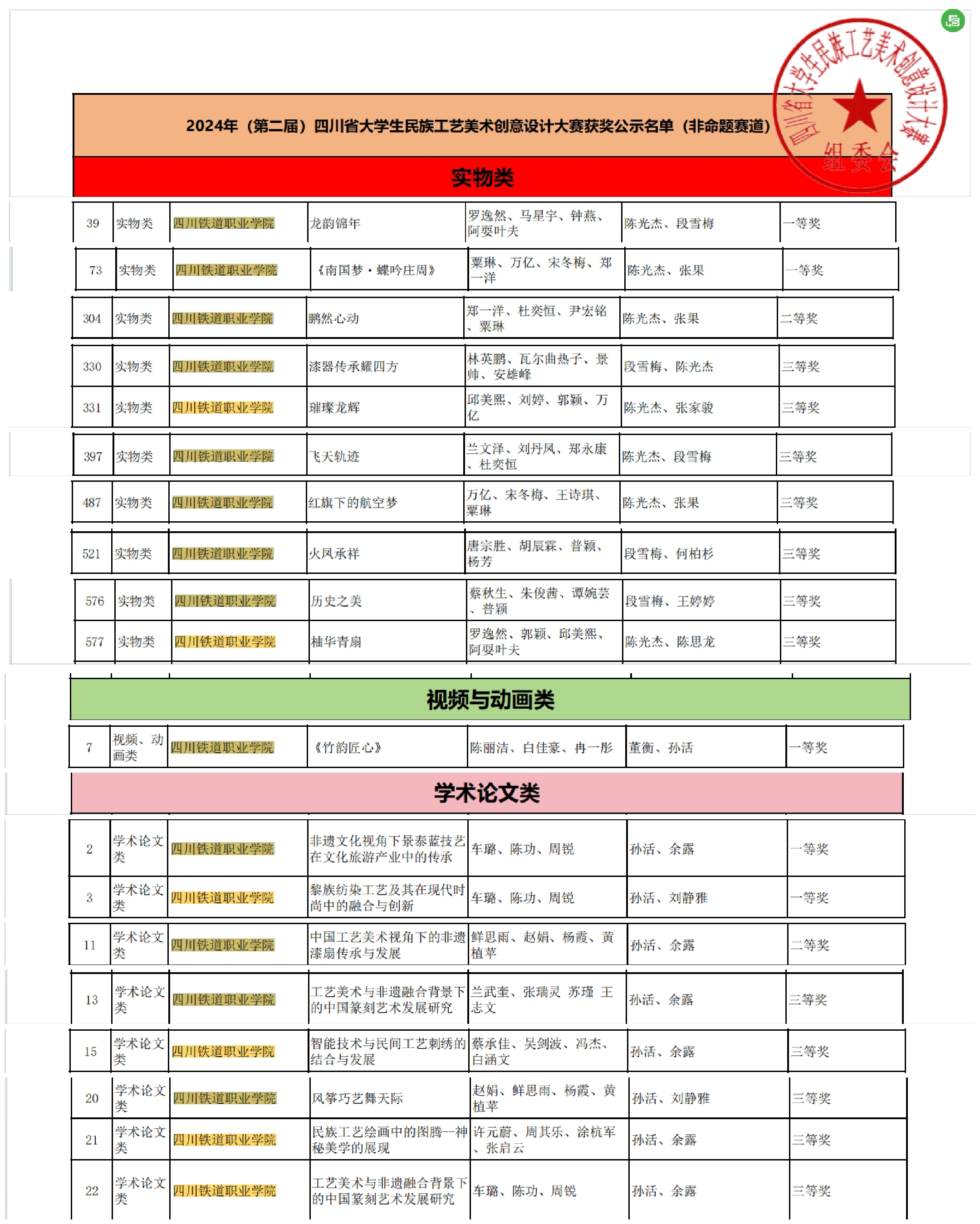 11月23日,由四川省教育厅主办的第二届四川省大学生民族工艺美术创意设计大赛决赛在阿坝师范学院隆重举行。beat365参赛团队凭借出色的创意设计与扎实的专业实力再创佳绩,斩获一等奖5项、二等奖2项、三等奖12项,充分展现了川铁学子的实力与风采。