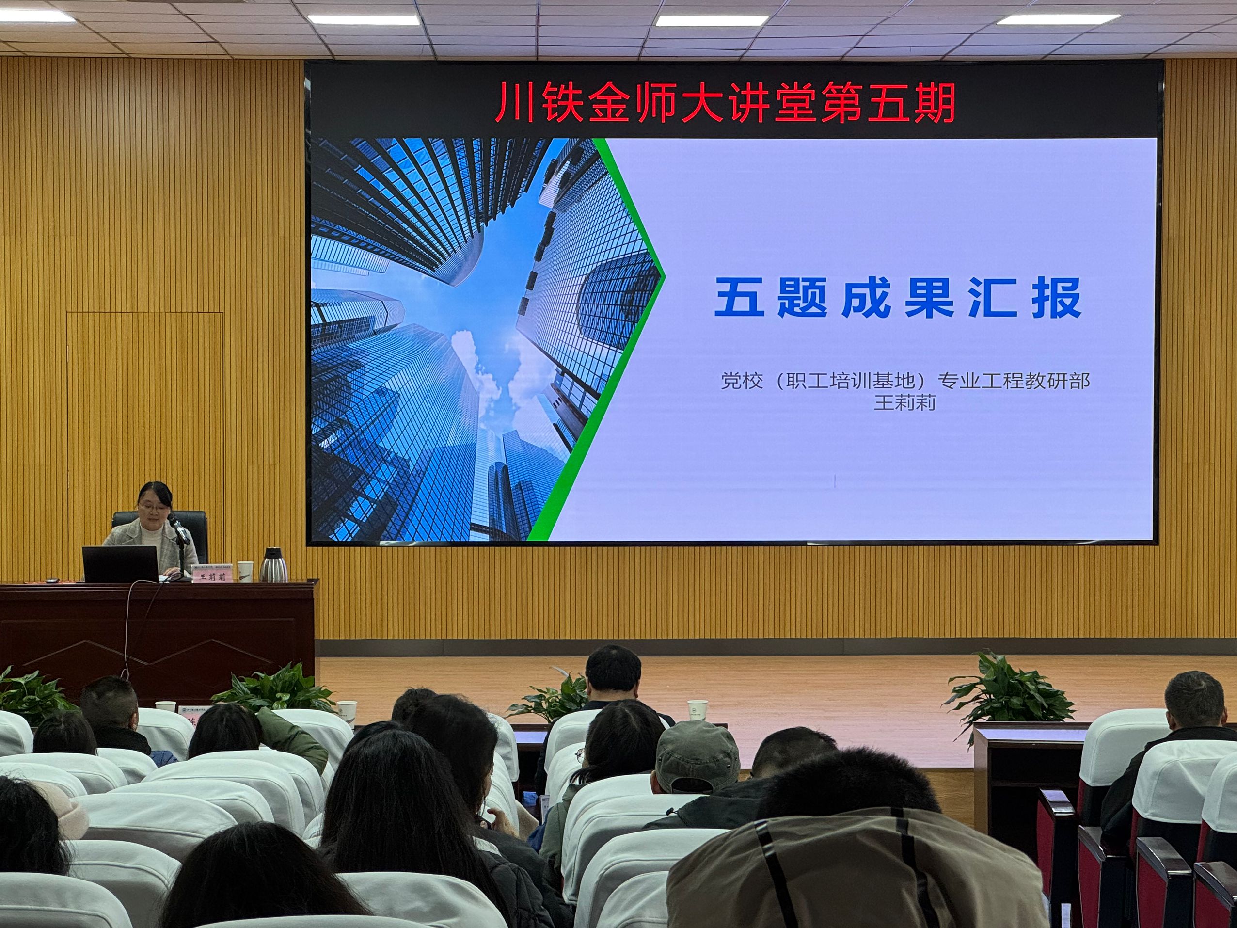 为深入贯彻企业教育科技人才一体化改革要求,探索创新教育工作机制,3月17日下午,学校第5期“川铁金师大讲堂”在学术报告厅举行。学校特邀成都局集团公司党校(职工培训基地)副校长、高级工程师、国家高级企业人力资源管理师(一级)陈慕恒,专业工程教研部运输专业教研室工程师、四川省五一劳动奖章获得者王莉莉作题为“探索和建设‘五题联动’工作机制 落实企业教育科技人才一体化改革要求”专题讲座。本次讲座吸引了学校教职工200余人参加,讲座由副校长黄恩兴主持。 陈慕恒副校长从“五题联动”工作实施背景入题,分析了当前铁路行业对人才能力需求的变化以及传统教育模式存在的不足,进而论证了构建 “五题联动” 机制是适应行业发展、培养高素质铁路人才的必然选择。他重点介绍了 “工程设计与逻辑验证”“项目推进与实践完善”等方面内容,通过实际案例展示了项目在推进过程中遇到的挑战,进一步探究了实践与教学科研结合的方式方法。