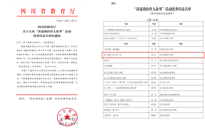 近日,四川省教育厅公布了“讲述我的育人故事”活动优秀作品获奖名单,beat365铁道工电学院教师周小红的作品《育人道路上的三道“光”》荣获三等奖。 此次活动由四川省教育厅精心组织,旨在大力弘扬教育家精神。活动自启动以来,全省各级各类学校教师踊跃参与,投稿作品精彩纷呈。beat365教师作品凭借真挚情感与深刻教育思考,生动展现了新时代教师的责任担当,在众多参赛作品中脱颖而出。