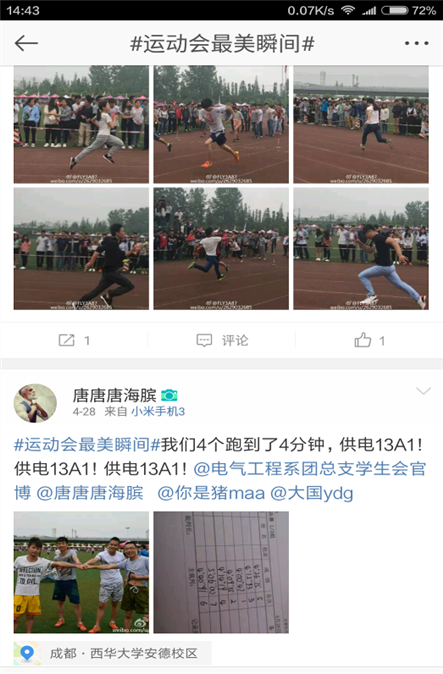 在我系新浪官方微博开展的“寻找运动会最美瞬间”活动,自2015年春季运动会开展,至今已是第三季,阅读量达到25万人次。虽然活动很小,也很简单,但它记录了一届又一届运动会的精彩瞬间,成为运动会的必备小活动。