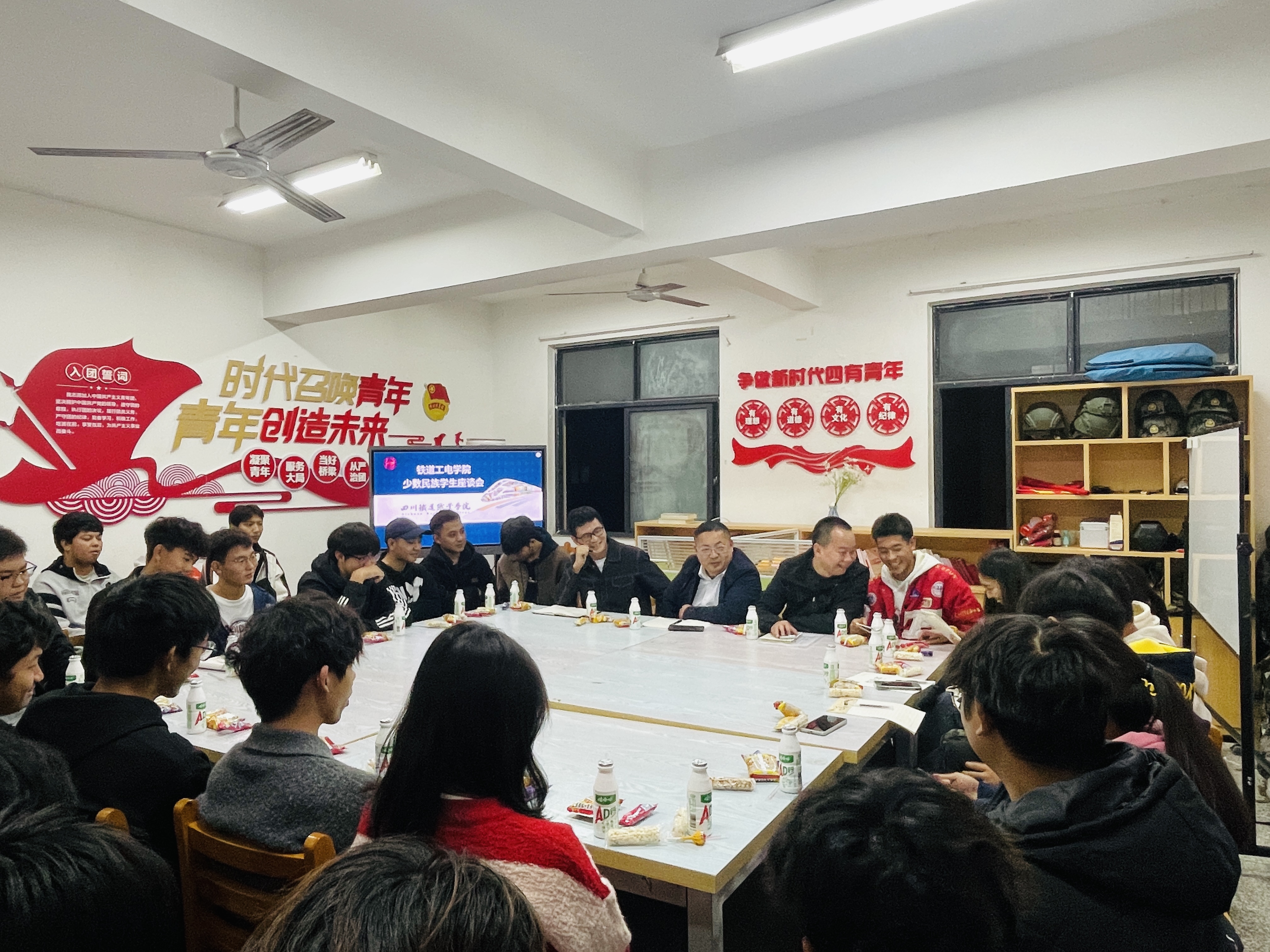 为深入贯彻党的民族政策,坚持不懈铸牢中华民族共同体意识,切实关爱少数民族学生成长,2025年11月6日,铁道工电学院在"一站式"学生社区2402成功举办少数民族学生座谈会。学院党总支书记王立,学生科科长陈光杰,辅导员刘奥与来自回族、苗族、黎族、彝族、蒙古族等多个少数民族的50名学生代表共叙心声,共绘未来。