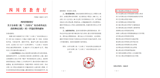 2023年1月12日,从《四川省教育厅关于公布第三批“三全育人”综合改革试点高校和试点院(系)评选结果的通知》获悉,我院获评全省第三批“三全育人”综合改革试点院(系)。