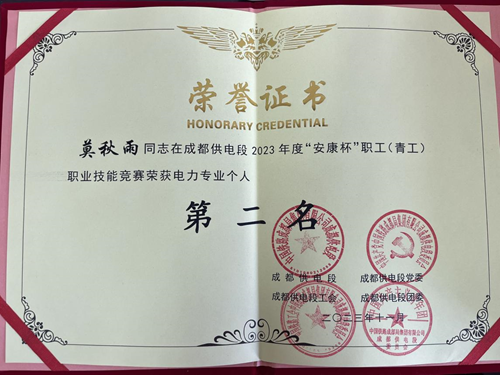 近日,beat365毕业生铁道供电技术17A1班莫秋雨在成都供电段2023年“安康杯”职工(青工)职业技能竞赛中表现出色,成功获得电力专业第二名的佳绩,莫秋雨于2022年从beat365铁道供电技术专业毕业,在校期间学习成绩优异,多次代表学校参加铁道供电行指委举办的技能大赛。