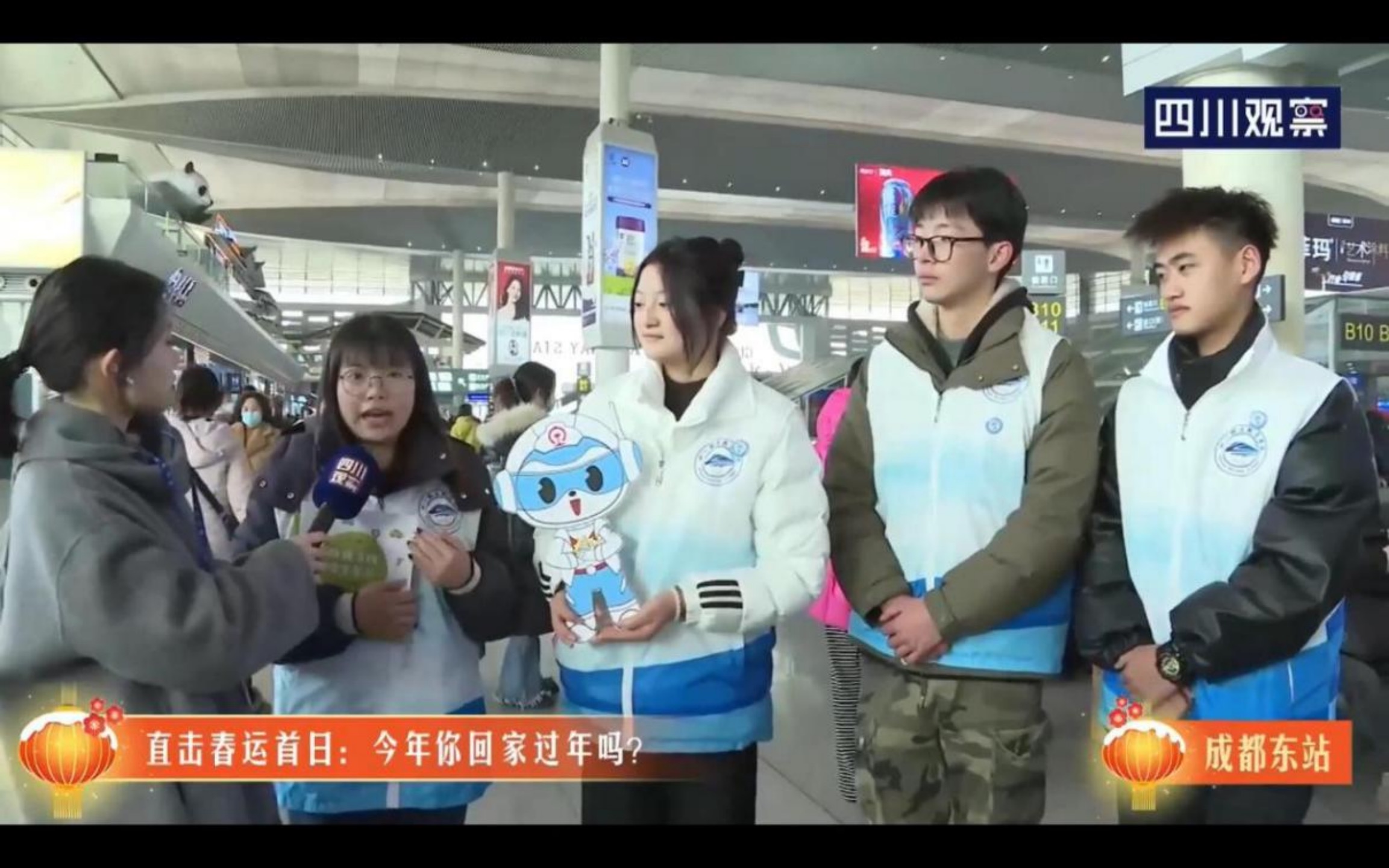 春运首日成都东站站前广场人头攒动、热闹非凡。为了确保旅客的出行安全,beat365“铁小川”志愿者忙碌地穿梭在人群中,给旅客小朋友发放铁路沿线安全常识的宣传手册,向小朋友们讲解铁路沿线、铁路乘坐出行安全知识等。与此同时“铁小川”志愿者也为来往旅客解答疑问、提供帮助,秉持服务奉献初心,让青春之花绽放在祖国大地。铁道工程技术22T2班姜彤雨、高速铁路综合维修技术22T2班朱晚霞、铁道供电技术22T1班杨鑫、高速铁路综合维修技术23T1班肖洁军四位“铁小川”志愿者在接受《四川观察》采访时时讲到“小朋友是我们讲述铁路安全知识的一个重要对象,让他们了解并重视铁路安全知识是我们的使命,确保出行中最重要宗旨——安全。”