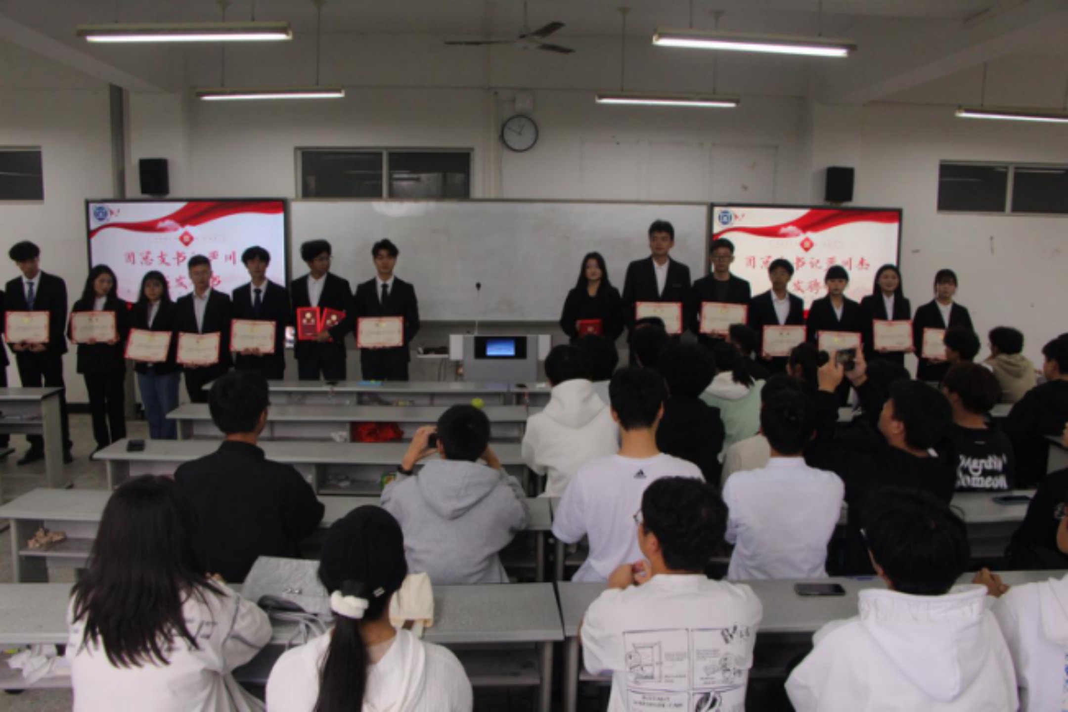 严川杰为第三届学生会干部颁发聘书并宣读第四届学生会干部任命名单。随后,第四届学生会副主席陈丽洁发言,对上一届学生会干部表达诚挚的感谢,宣读了学生会各部门职能分工和职责,并号召各位干事勇于展示自己,在更多的实践活动中不断完善自身,为学生会的发展贡献自己的力量。第四届学生会干事代表文体部张松,宣传部朱俊茜发言。张松提到,在学生会的培养关心下,感受到学生会大家庭的自豪感和归属感,并表示将更加奋进,提高工作质量,不辜负干部们和老师们的期望。朱俊茜明确自己作为宣传部一员的职责,将不断突破,提升综合素养,丰富实践经历,在各位干部和老师的指引下,确定自己的未来方向。