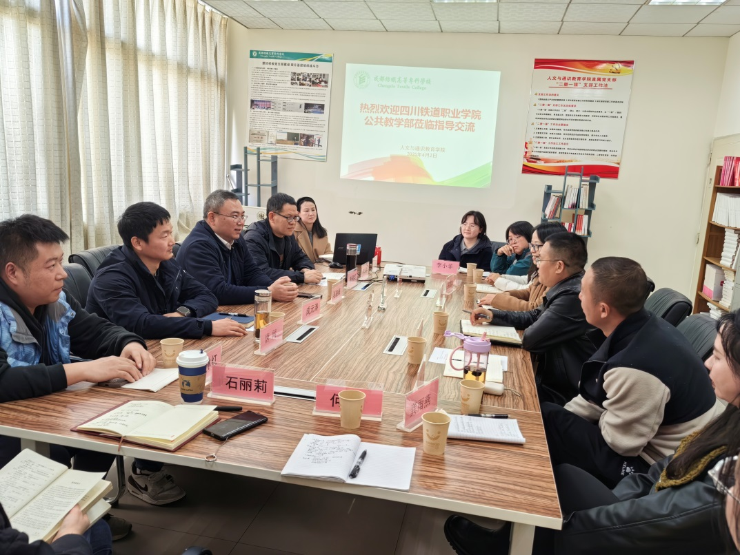 为进一步推进公共基础课教学改革,不断提升学生职业综合素养,为学生成才镶好“金边”,4月2日下午,公共教学部负责人刘真安率语文、数学、英语、体育、艺术、国防与国家安全教研室主任和青年教师代表一行9人到成都纺织高等专科学校学习交流,成都纺织高等专科学校人文与通识学院、体育工作部、外语与文化旅游学院和艺术设计与创意学院的领导及部分教研室主任接待了调研团队。