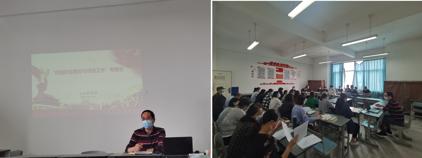 为加强校园安全稳定与信访工作,2022年4月11日下午,公共教学部在2501教室召开了“校园安全稳定与信访工作”专题会,会议由副主任杨伦军主持,公教部全体教师参与了此次会议。