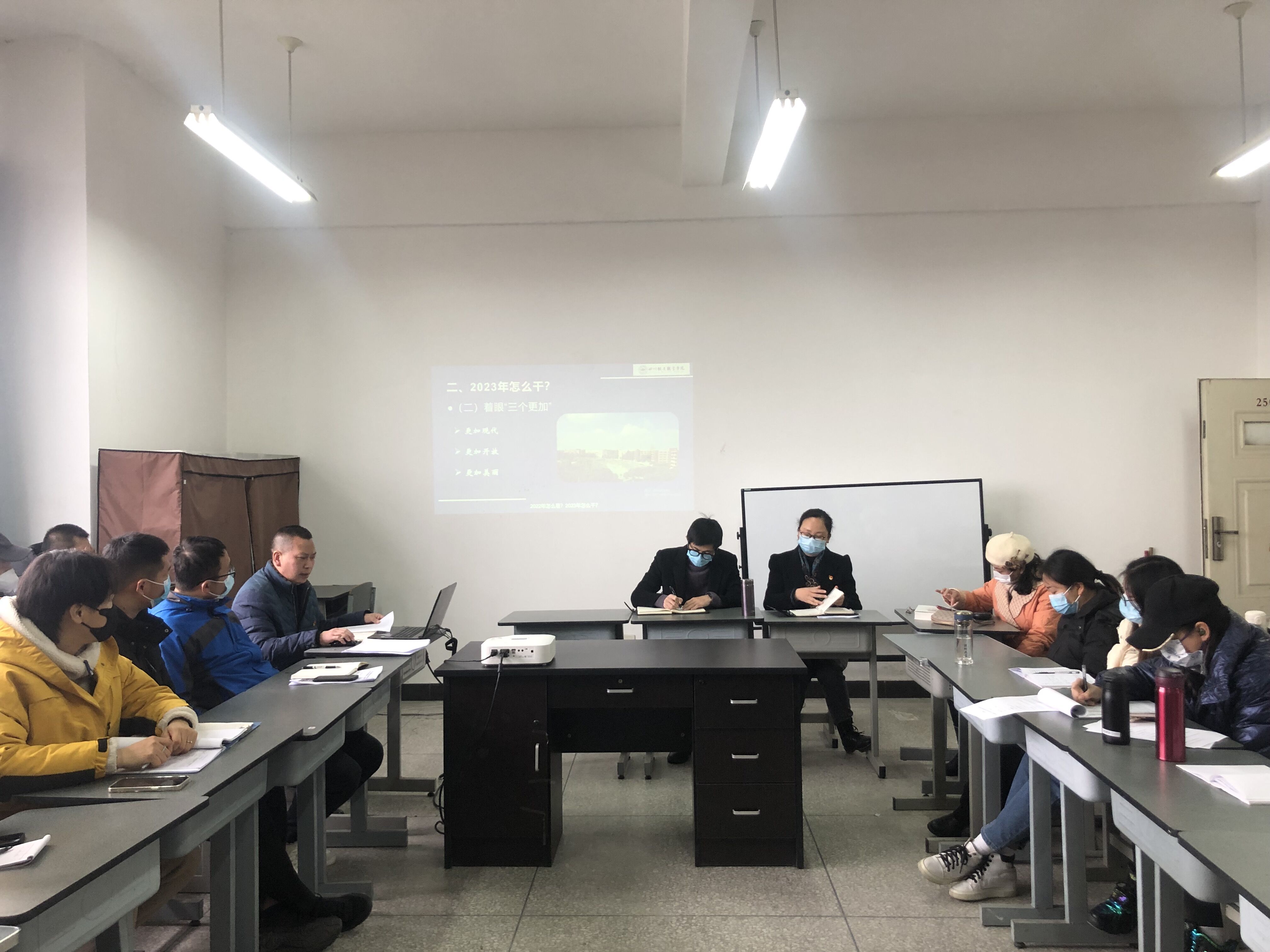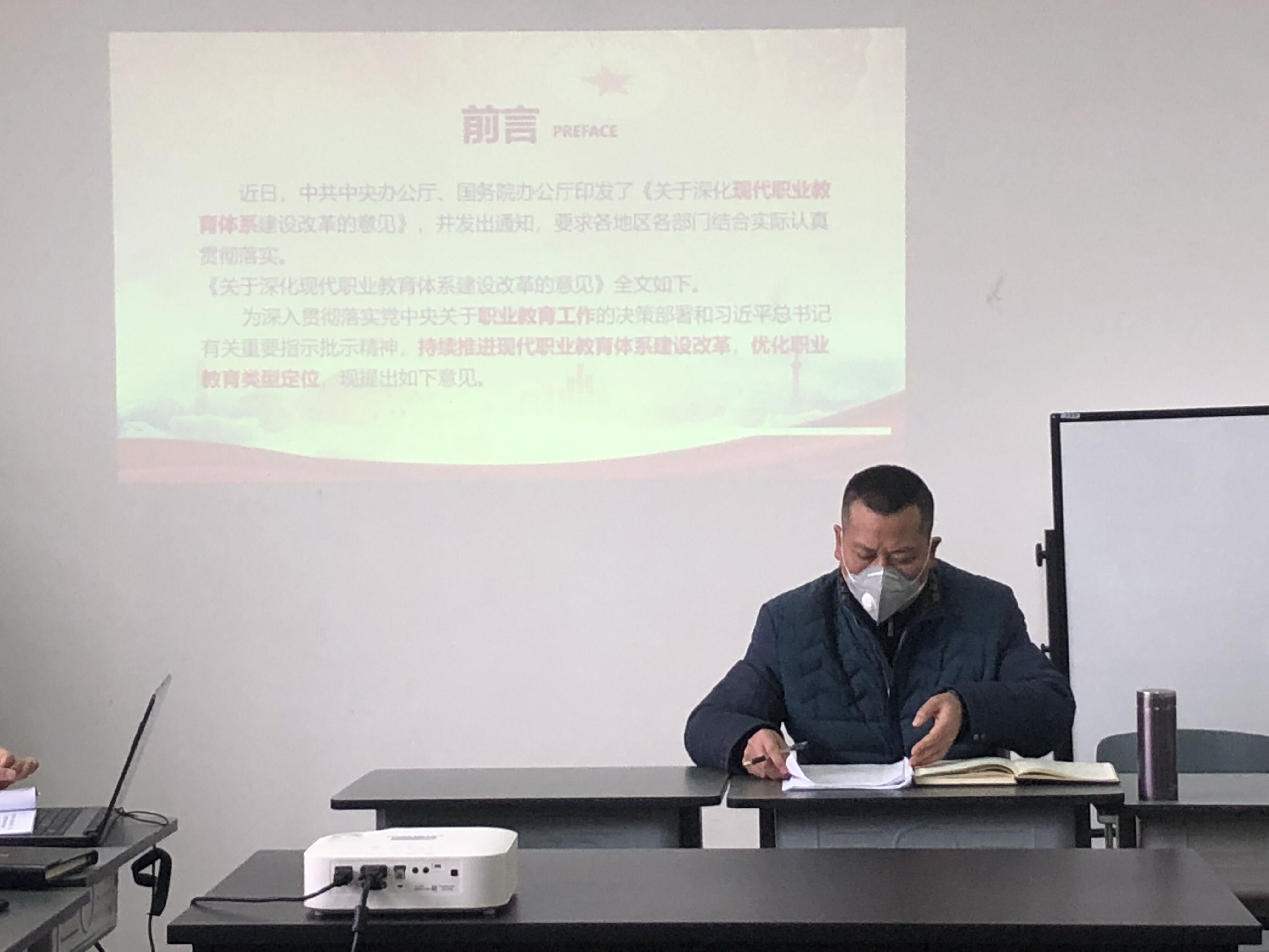 为认真贯彻落实《关于深化现代职业教育体系建设改革的意见》等文件精神,根据《中共beat365在线唯一官网委员会关于深入学习宣传贯彻党的二十大精神工作方案》要求,2023年1月9日,公共教学部组织召开《关于深化现代职业教育体系建设改革的意见》专题学习会暨寒假工作部署会。公共教学部全体教师参加了本次会议。