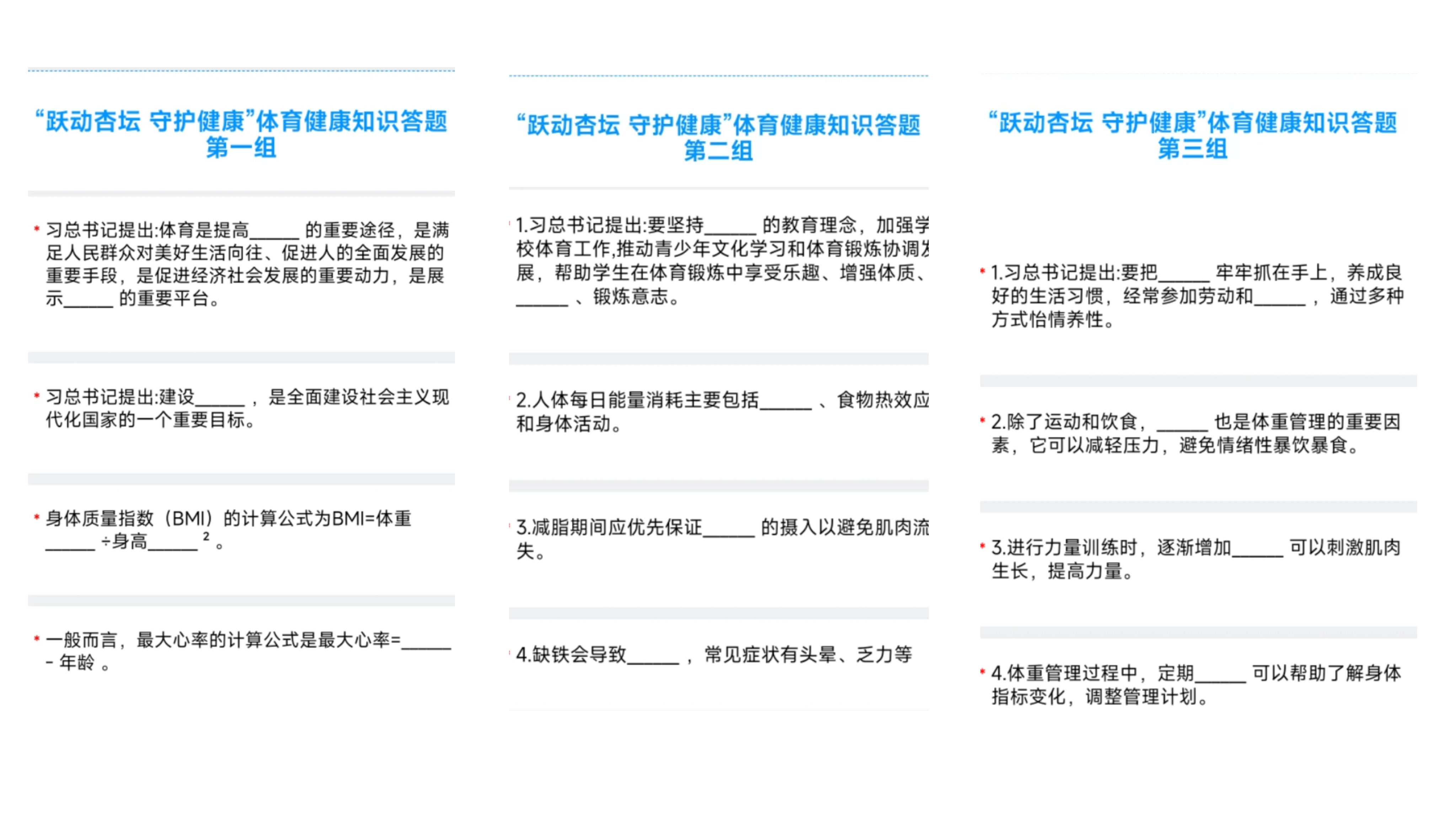活动内容紧密围绕习近平总书记关于体育强国建设的重要论述,以及《全面加强和改进新时代学校体育工作的意见》展开,同时融入体重管理核心知识。题目广泛覆盖身体质量指数(BI)计算、膳食营养搭配、运动处方设计等领域。通过这些知识,引导教职工从“体重管理”切入,系统掌握科学健身方法。