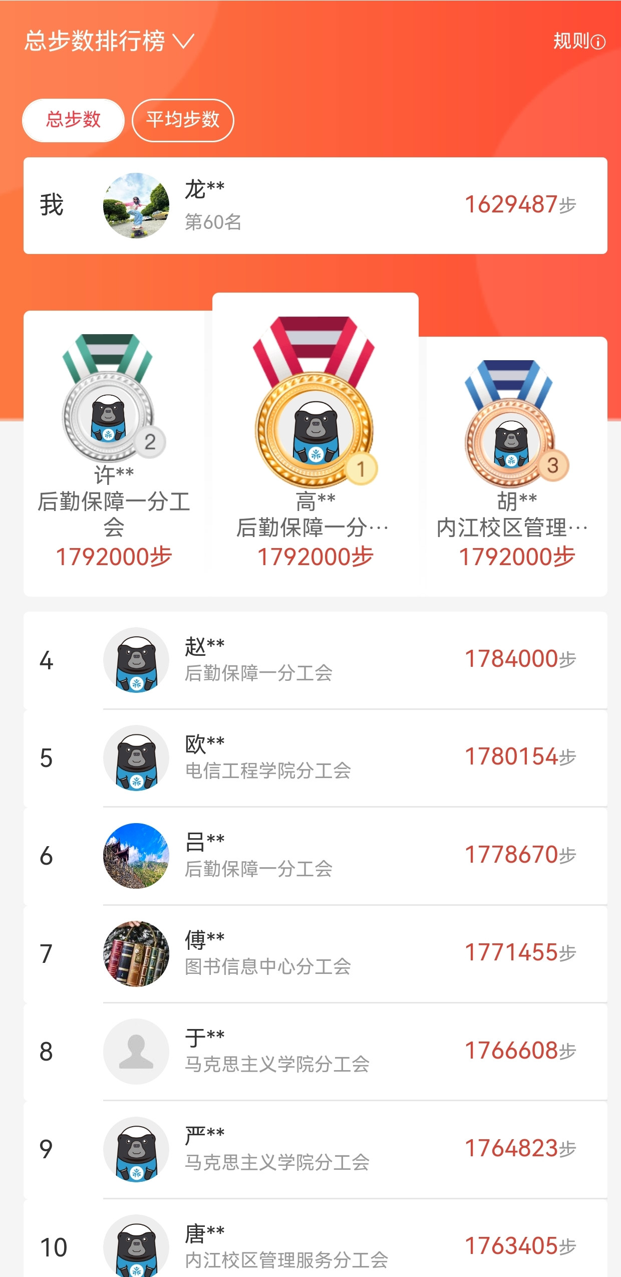 学校第二届体育文化节线上健步走活动圆满落幕。活动以“运动不停歇 奔跑川铁人”为主题,鼓励教职工通过室外健步运动增强体质,展现团结奋进精神。自4月14日启动,持续至11月23日,吸引了578名教职工参与,最终441人达标,达标率76.3%。