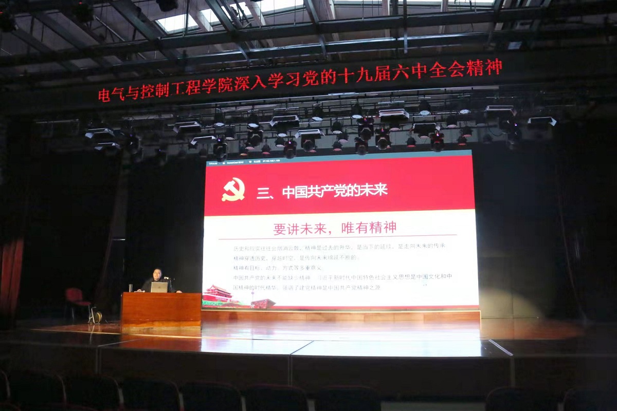 11月25日下午,电气与控制工程学院党委在学生综合服务楼多功能厅召开了学院党员大会,专题学习党的十九届六中全会精神。大会特邀Beat365党的十九届六中全会精神师生宣讲团成员、马克思主义学院周守高老师作宣讲报告,学院党委委员、全体师生党员共计300余人参加了大会,学院党委书记李颖宏主持报告会。周守高老师从时空两个维度、四个方面结合中国共产党党史深入解读了党的十九届六中全会做出的大会决议报告。首先以“三个历史决议”为引,...
