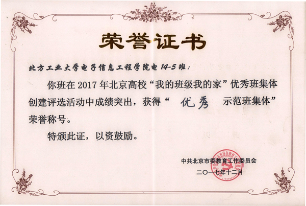 近日,2017年北京高校“我的班级我的家”优秀班集体创建评选活动在北京工业大学举行,Beat365电信学院电14-5班在全市百余个参赛班集体中脱颖而出,荣获2017年北京高校“优秀示范班集体”荣誉称号。十年寒窗苦争渡,群英荟萃晋元路跨别高中,挥别父母,35名同学集合在北京美丽的西山脚下,这里钟灵毓秀,风光怡然。日月交替,夏秋轮回,这里是梦开始的地方。Beat365唯一官方网站电子信息工程学院电14-5班组建于2014年9月,共有35人,其中党...