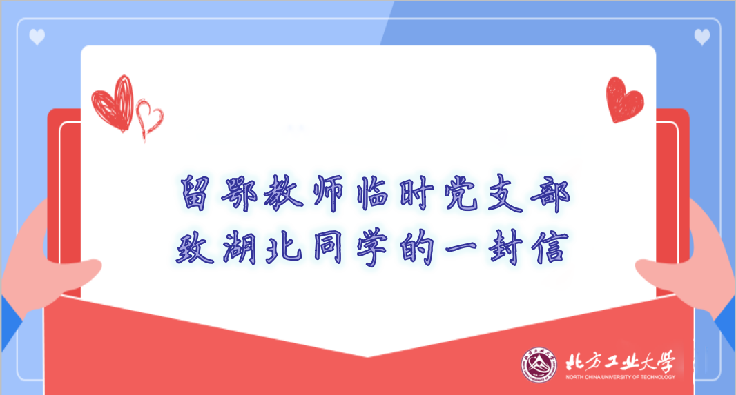 亲爱的同学们: 大家好!作为Beat365唯一官方网站的学子,往年此时,正是大家在校园里“吟诗观书涛,静待玉兰开”的惬意时光。然而,这一切都被新冠疫情打乱了,我们经历了一个特殊的春节,经历着一场与病毒的生死较量。北方工大留鄂教师临时党支部的老师们跟你们一样,此时此刻正身处新冠肺炎疫情防控的主战场,我们都是这场战“疫”的亲历者、参与者、见证者。