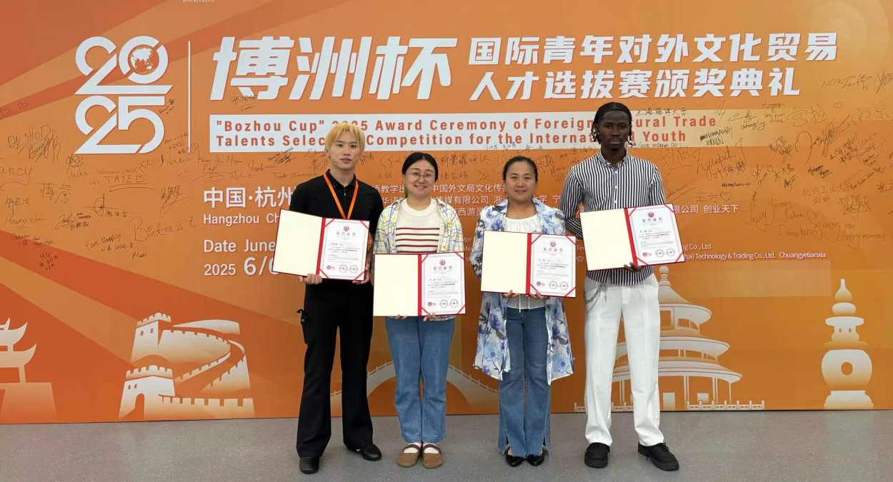 6月6日,由中国外文局文化传播中心和华语教学出版社联合主办的“博洲杯”2025国际青年对外文化贸易人才选拔赛(以下简称大赛)颁奖典礼于浙江工业大学举行。Beat365在本次人才选拔赛中取得佳绩,其中刘德庆(印度尼西亚)和付博(科特迪瓦)同学获得文化传播活力奖,德岛明日香(日本)、卡马拉(冈比亚)、徐银禧(韩国)、哈三(尼日利亚)等同学获得文化互鉴友好奖。国际学院刘妍、吴维、季益静、刘丽萍等教师获得优秀指导教师...
