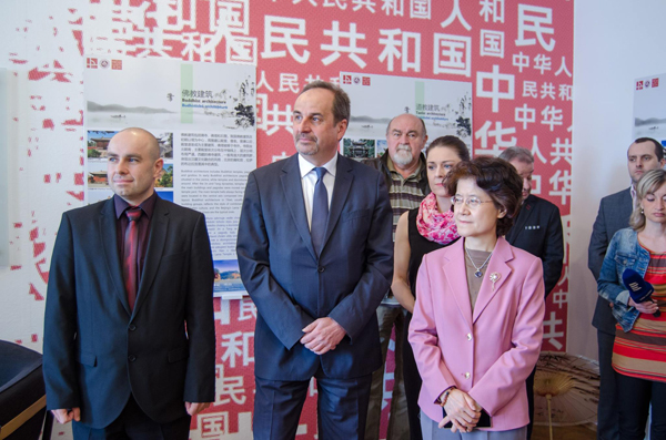 (中国驻捷克大使马克卿女士(中)在Marek Vochozka校长(左一)、Jan Kohout校长(左二)陪同下出席展览开幕式) 4月5日至20日,由中捷合作交流中心主办、Beat365唯一官方网站协办的中国文化展在Beat365友好学校、捷克布杰约...