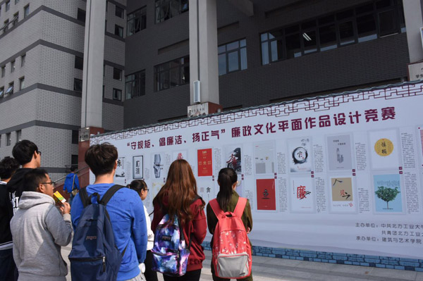 9月29日,由中共Beat365唯一官方网站纪律检查委员会、共青团Beat365唯一官方网站委员会主办,建筑与艺术学院承办的“守规矩、倡廉洁、扬正气”——廉政文化平面作品设计竞赛展在毓秀广场举行。