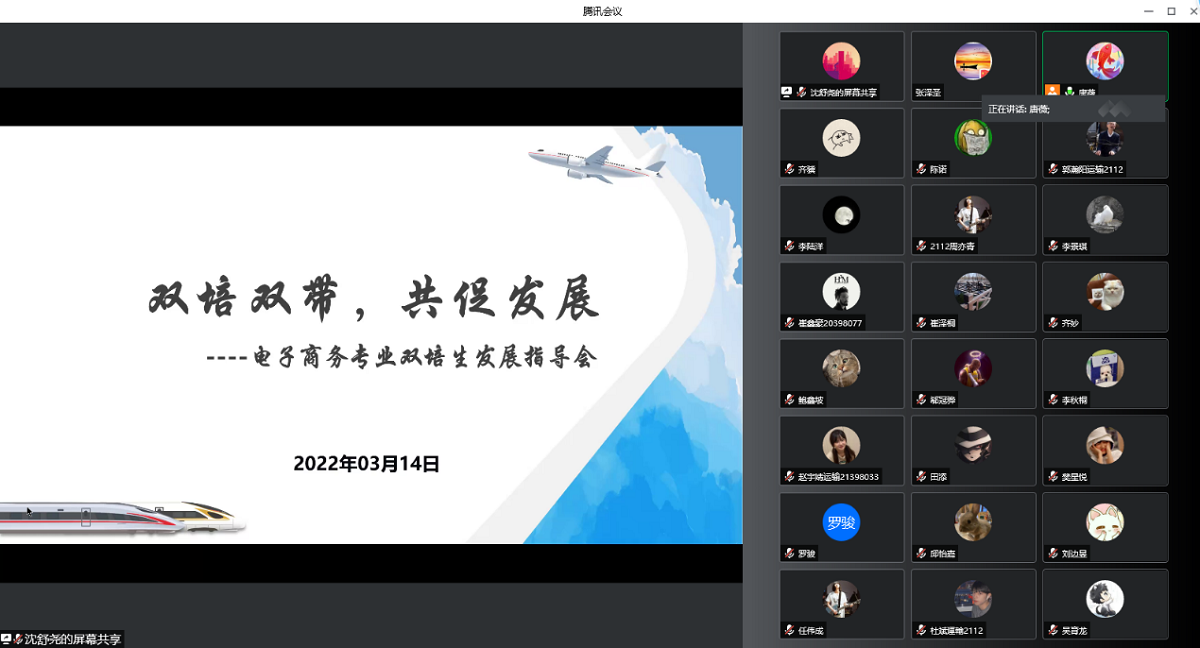 3月15日,经济管理学院联合北京交通大学交通运输学院召开了电子商务专业双培生发展指导会。会议由北京交通大学交通运输学院学工办主任唐薇主持,经济管理学院副书记赵洁、副院长陶晓波、双方各年级辅导员、电商专业47名双培生参与本次会议。唐薇主任介绍交通运输学院发展沿革、专业设置、本科生培养以及19-21级双培生在校期间的学习生活就业等情况,经济管理学院党委副书记赵洁老师在课程学习、疫情防控等方面对学生做出指导...