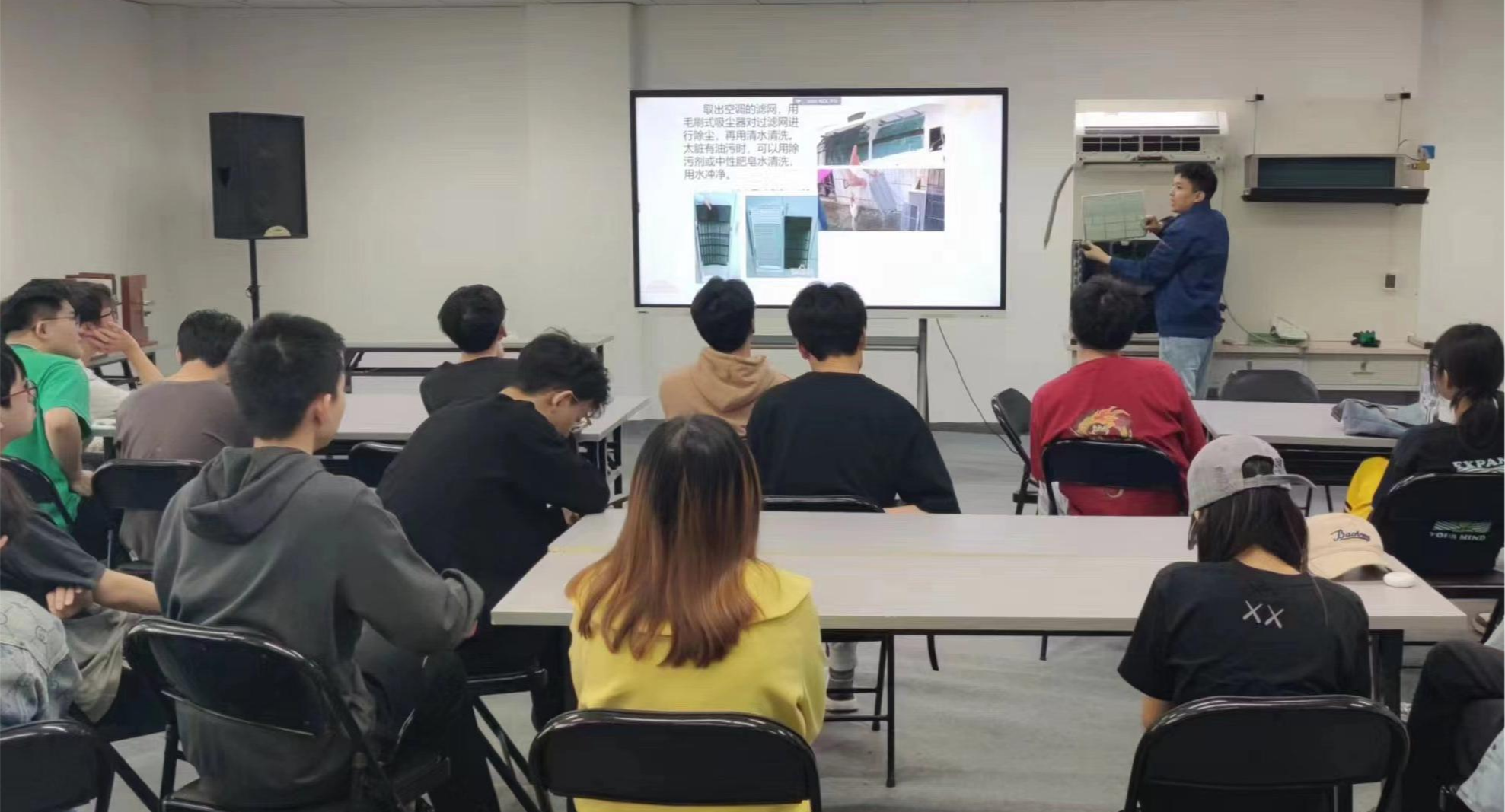 4月25日,空调设备使用与维护公益劳动课在图书信息楼一层会议室开课,吸引了众多对空调技术感兴趣的同学参与。此次课程采取理论与实践相结合的教学方式,为同学们提供了一个深入实践工程专业劳动技能的平台。服务中心设备维修班长贾建新作为主讲老师,介绍了Beat365中央空调机组类型及分布情况,分析了单分体式空调设备构造、制冷循环到空气调节的工作的基本运作原理,讲解了空调清洗养护的步骤、方法以及空调使用小技巧等内容,演...